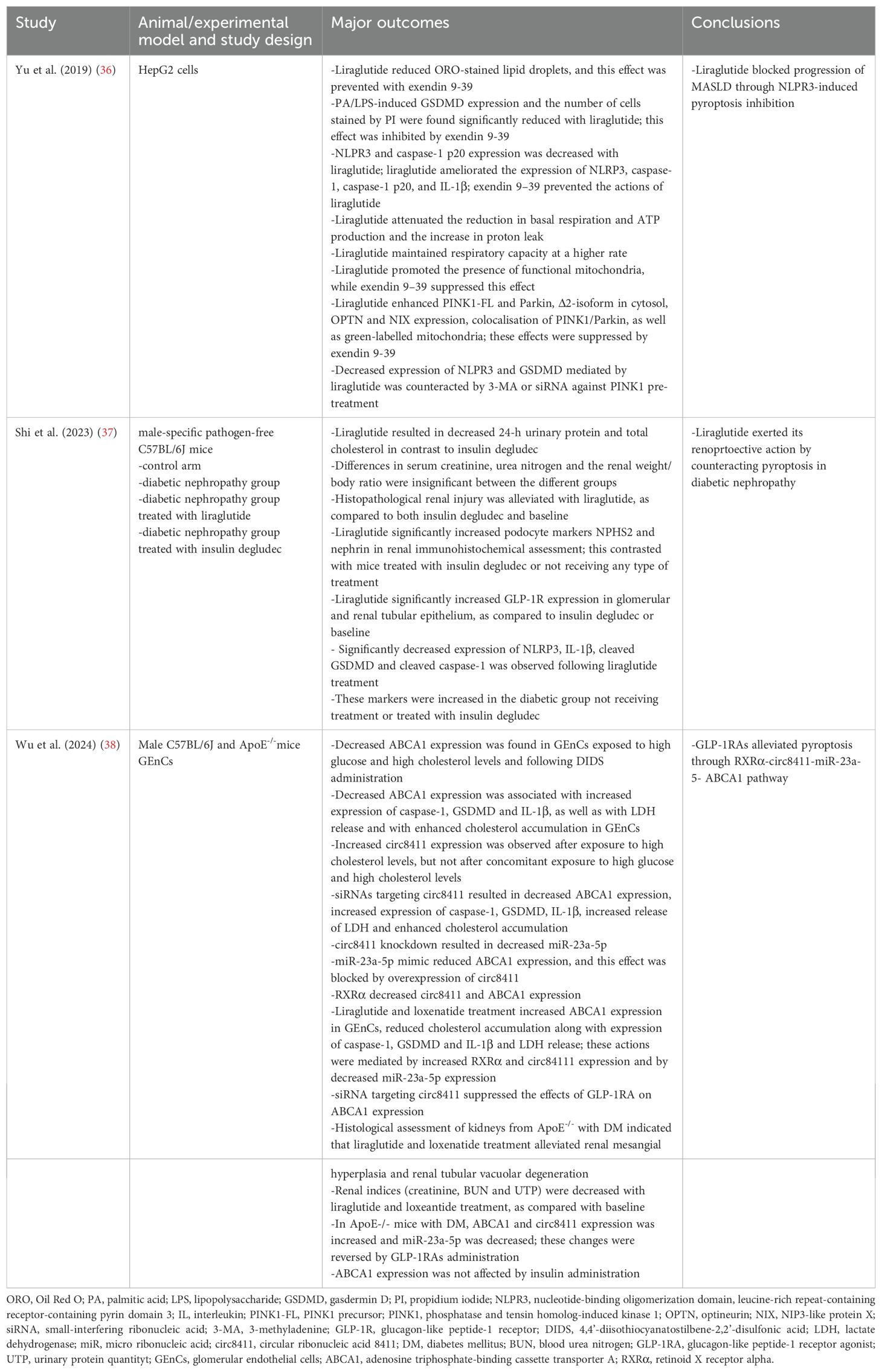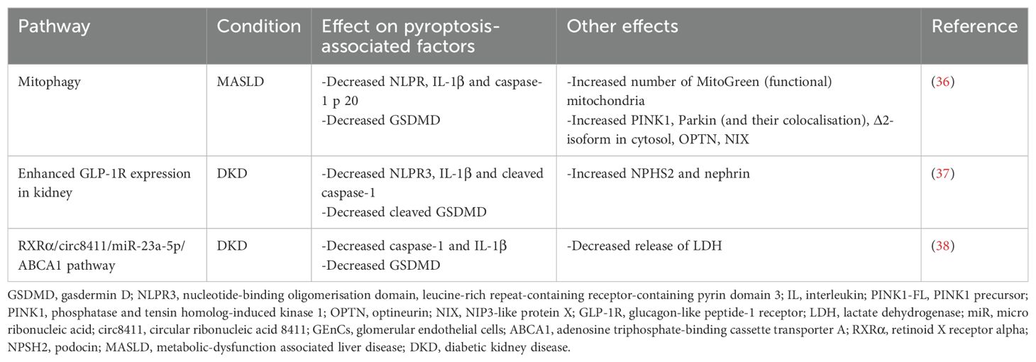 To date, only a limited number of studies have assessed the effect of GLP-1RAs on pyroptosis in diabetes-associated conditions. Studies on diabetic kidney disease and MASLD have been conducted (36–38). Two cell-based studies including HepG2 and GeNCS and two experimental studies, featuring C57BL/6J mice were conducted (36–38). In these studies, liraglutide was the main GLP-1RA applied (36–38). Furthermore, exendin 9-39 (due to its inhibitory effect) (36), insulin degludec (37) and loxenatide (38) were used. In terms of pyroptosis, liraglutide was associated with diminished GSDMD (36). Liraglutide ameliorated the presence of lipid droplets and enhanced cell viability in the cell model for MASLD (36). In mice, a similar trend towards diminished GSDMD was noted with liraglutide and was associated with restored podocyte markers and improved renal morphology (37). Interestingly, circ8411 was a major protective molecule against pyroptosis (38) and ABCA1 expression was significantly improved with liraglutide (38). Pyroptosis indices, including caspase-1 or IL-1β, were improved with GLP-1RAs (36–38).