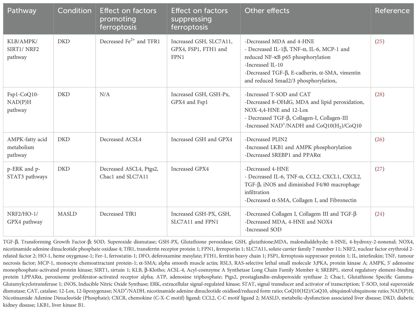 Furthermore, GLP-1RAs exhibited both anti-inflammatory and anti-fibrosis properties (e.g. TGF-β), also affecting certain collagen types such as Collagen-I or Collagen-III and respective genes, such as Col1a2 and Col4a2 (24, 25, 27, 28). The significance of the AMPK pathway was considered in counteracting oxidative stress (AMPK/SIRT1/NRF2 pathway) and in association with LKB1 (25, 26). The benefit upon GLP-1RAs administration was prevented through AMPK inhibitor dorsomorphin (26). Inhibition of endocytosis and micropinocytosis also inhibited the positive effect of GLP-1RAs (26). The decrease in phosphorylated extracellular signal-regulated kinase (p-ERK) and phosphorylated signal transducer and activator of transcription 3 (p-STAT3) was suggested as a major underlying mechanism responsible for the effect of dulaglutide in renal fibrosis (27). All studies have identified potential signaling pathways mediating the effects of GLP-1RAs on ferroptosis (24–28). Nevertheless, the effect following inhibition of these pathways was examined only in a few of these studies (24, 25, 28). Consequently, not all studies confirmed the suggested mechanisms underlying the effects of GLP-1RAs on ferroptosis.