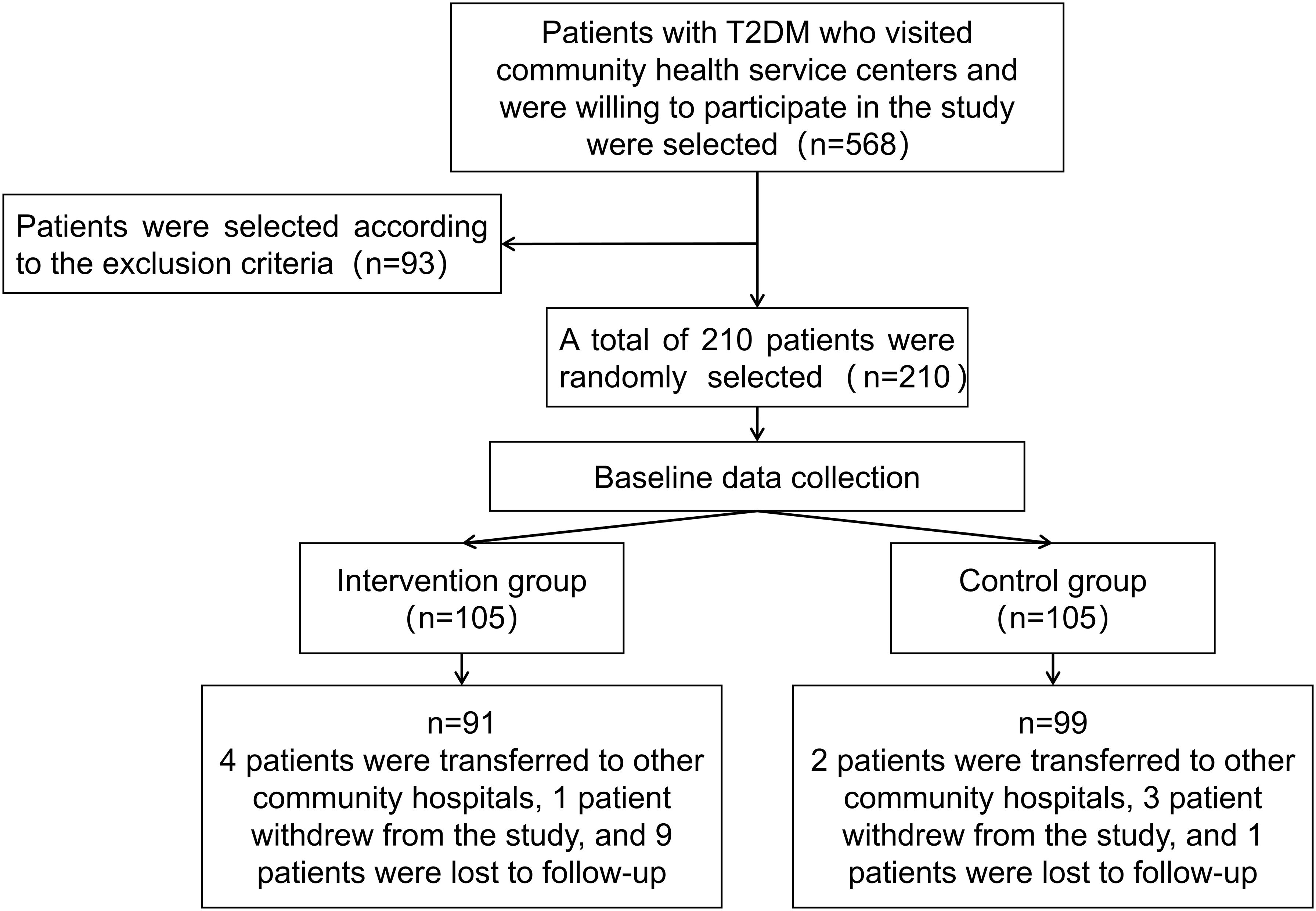 Patient enrollment began in May 2021 for two months. The follow-up duration was 12 months, with all patients completing their follow-up by June 2022. A total of 210 eligible patients who agreed to participate were divided into the experimental group (n=105) and the control group (n=105). Twenty patients dropped out during the follow-up, resulting in 91 patients in the experimental group and 99 in the control group being included in the statistical analysis. The average ages of the experimental group and the control group were 66.01 ± 7.38 years and 65.96 ± 8.81 years, respectively, consistent with the demographics of elderly patients primarily seen in community hospitals (24). According to the SDSCA scale guidelines, No notable disparities were observed between the two groups of patients in adherence to regular dietary habits and regular exercise habits without management. Baseline demographic data of the patients in both groups, including age, gender, duration of illness, family history of diabetes, smoking, alcohol consumption, diet, exercise, and complications (hypertension, hyperlipidemia), showed no significant differences (P>0.05). Blood glucose levels showed no statistically meaningful variations between the two groups, blood pressure, lipid levels, and BMI indicators (P>0.05). Detailed data can be found in Table 2.