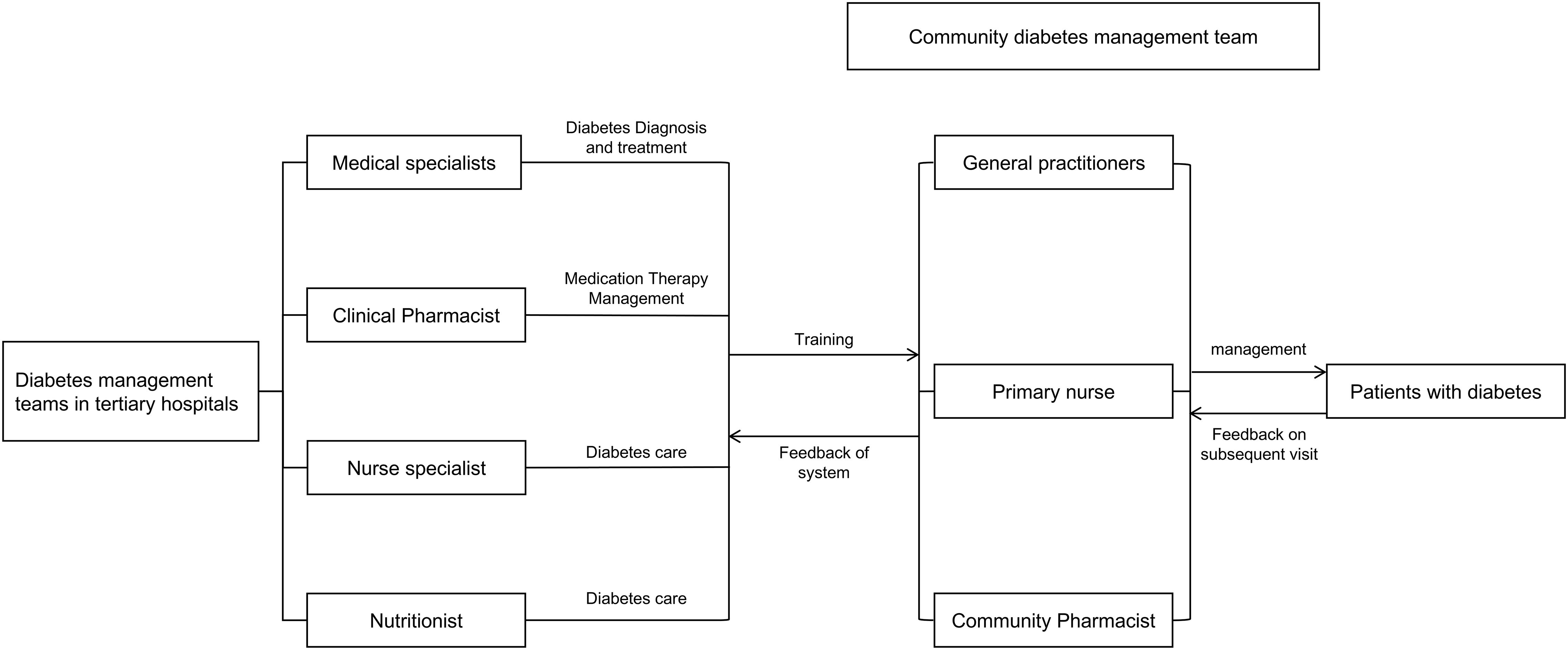 In collaboration with the Yuhuatai District Health Commission, Drum Tower Hospital, and three community health service centers governed by the Yuhuatai District Health Commission in Nanjing, our research group has established a medical consortium. Based on this platform, we have developed a hospital–community linkage model, a diabetes management framework that actively integrates clinical pharmacists into the continuum of care between tertiary hospitals and community health centers. This model draws on both international experiences (such as the Chronic Care Model and Transitional Care Model) (14, 15) and national health policies encouraging hierarchical diagnosis and treatment (16), and it aims to fill the gap of inadequate pharmaceutical care in community diabetes management (13). The rationale for pharmacist involvement in diabetes management can also be explained through behavioral theories. The Health Belief Model (17) highlights the role of perceived benefits, barriers, and cues to action in influencing adherence behaviors. Pharmacist-led counseling and continuous follow-up provide clear cues to action and reduce barriers by addressing medication concerns. Similarly, Social Cognitive Theory emphasizes self-efficacy, which is essential for chronic disease self-management (18). By providing education, skills training, and reinforcement, pharmacists enhance patients’ confidence to adhere to medications and engage in lifestyle modification. Therefore, the hospital–community linkage model is not only aligned with system-level frameworks such as the Chronic Care Model and Transitional Care Model (19, 20), but also grounded in behavioral theories that explain how pharmacist interventions improve clinical outcomes (21).