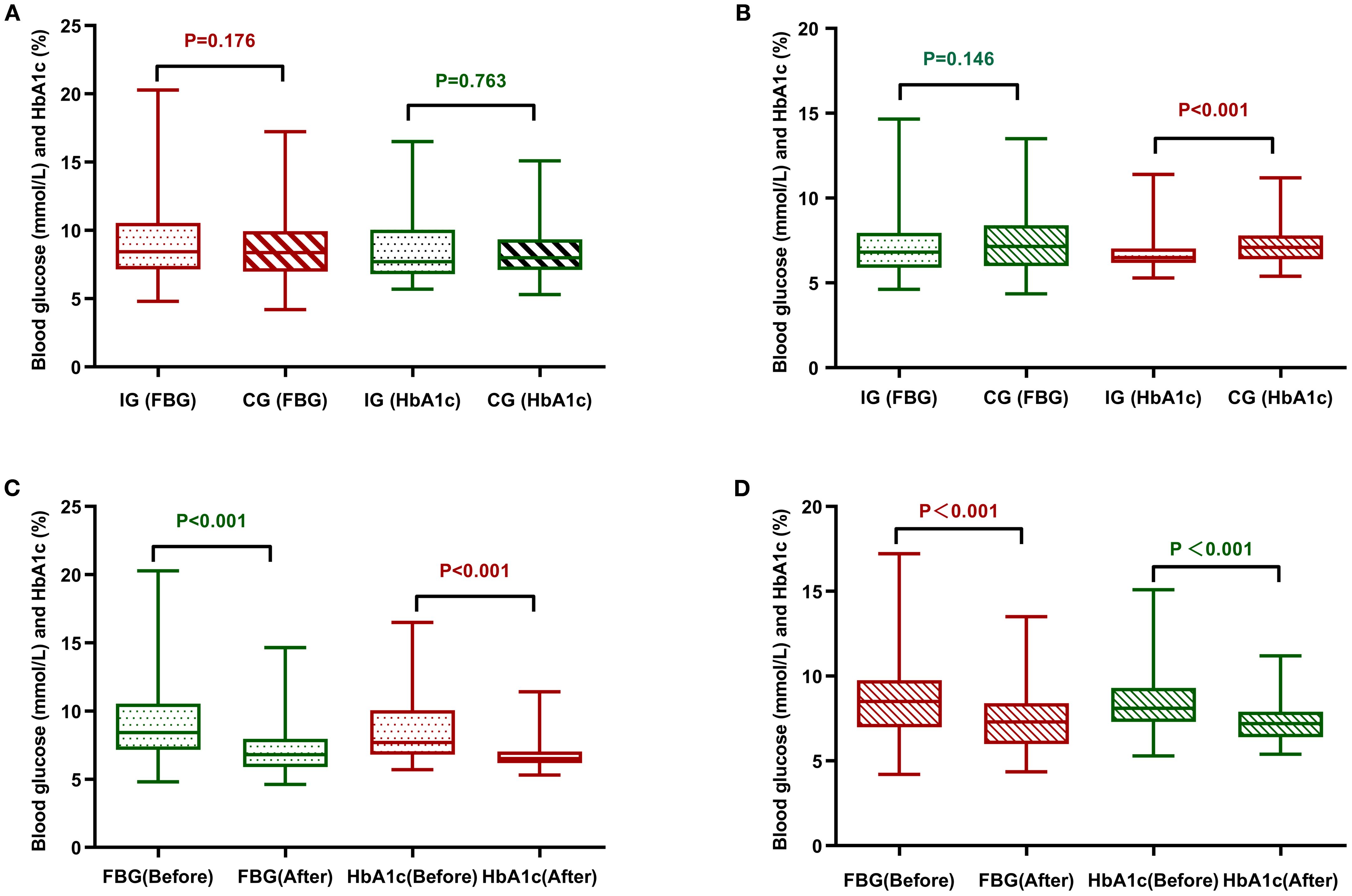 Figure 3. Comparative analysis of FPG and HbA1c between the two groups of patients. (A) Comparison of the two groups of patients before management. (B) Comparison of the two groups of patients after management. (C) Comparison before and after management of the intervention group. (D) Comparison of control group before and after management. CG, control group; IG, intervention group.