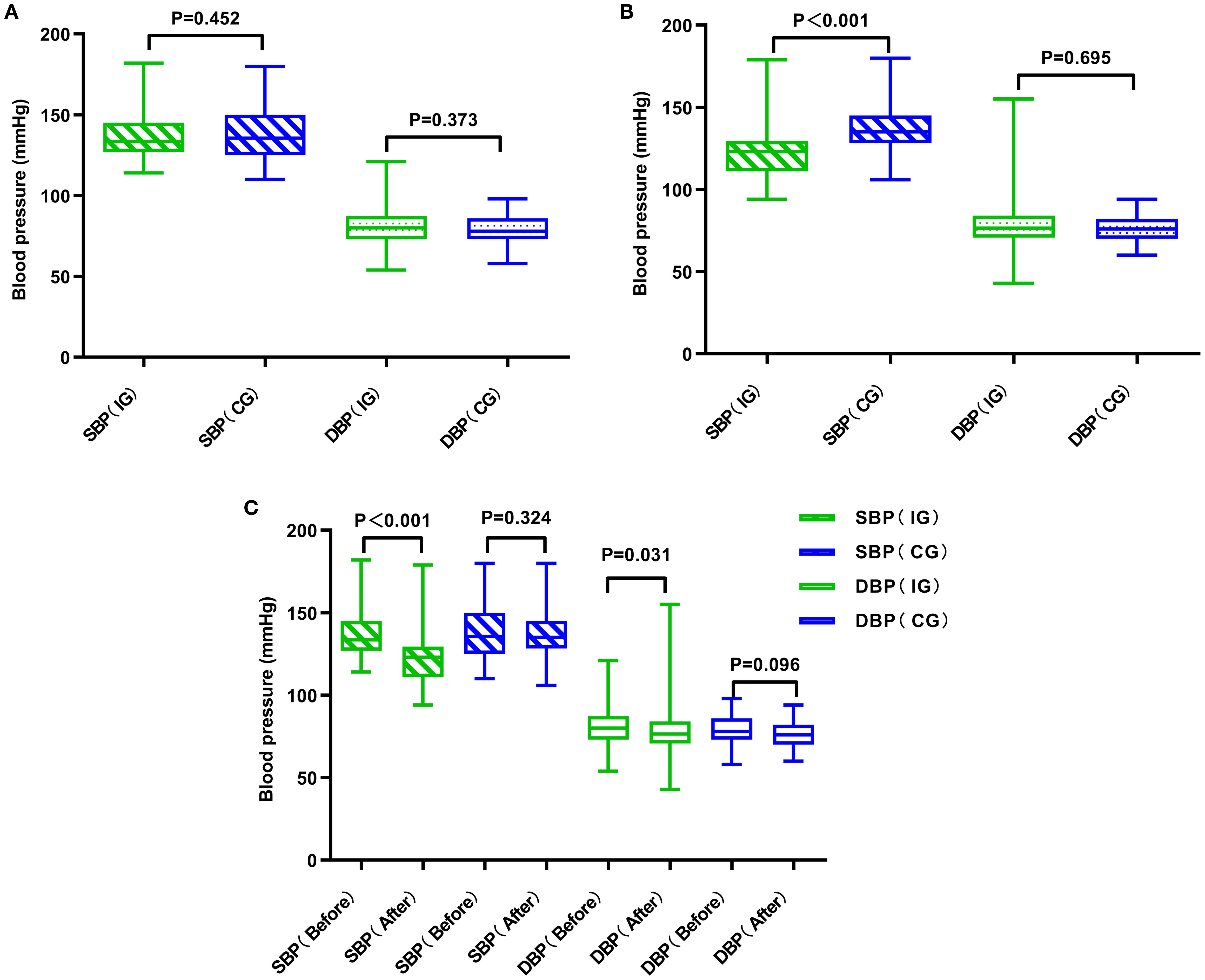 Figure 4. Comparative analysis of blood pressure in two groups of patients. (A) Comparison of the two groups of patients before management. (B) Comparison of the two groups of patients after management. (C) Comparison of the two groups of patients before and after management. CG, control group; IG, intervention group.