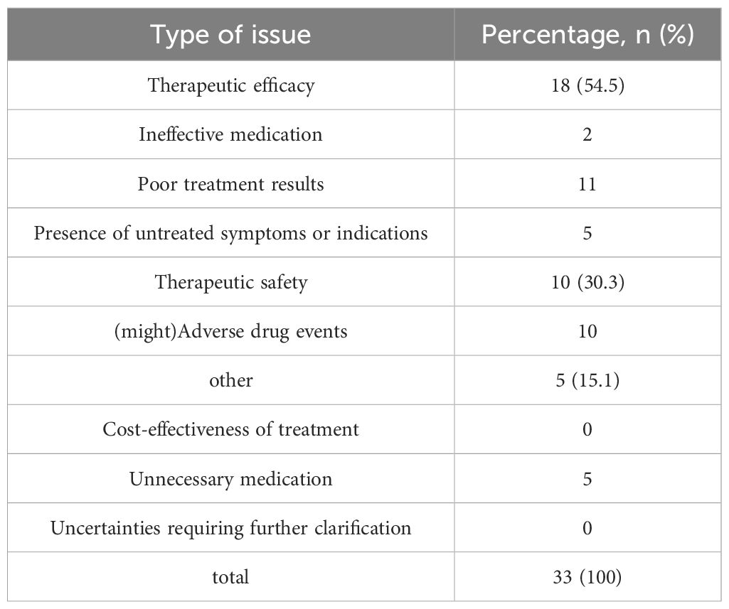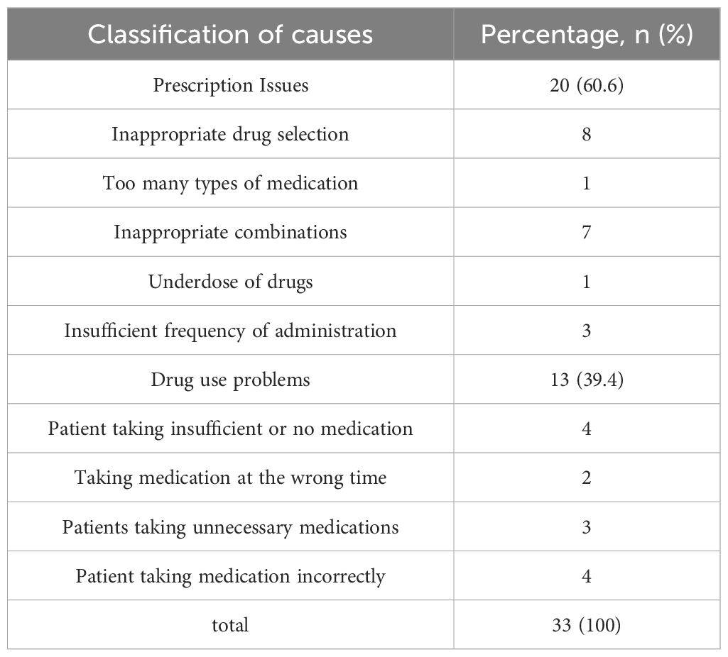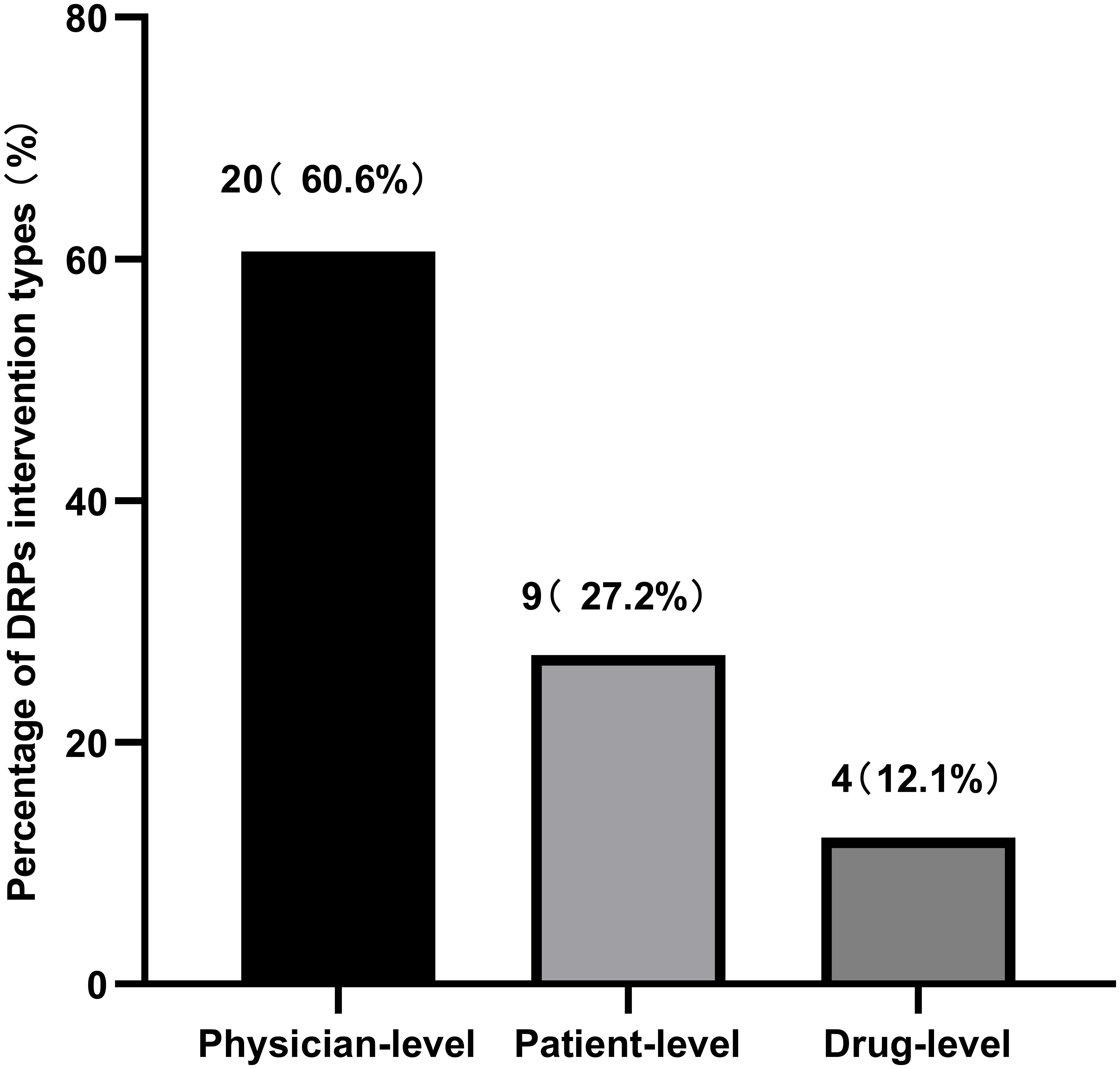During the treatment and follow-up periods, the incidence of DRPs in the experimental group was 37.3%. Table 8 documents the occurrence rates of various DRPs, and Table 9 lists the causes of these DRPs. The types of interventions for DRPs are shown in Figure 5.