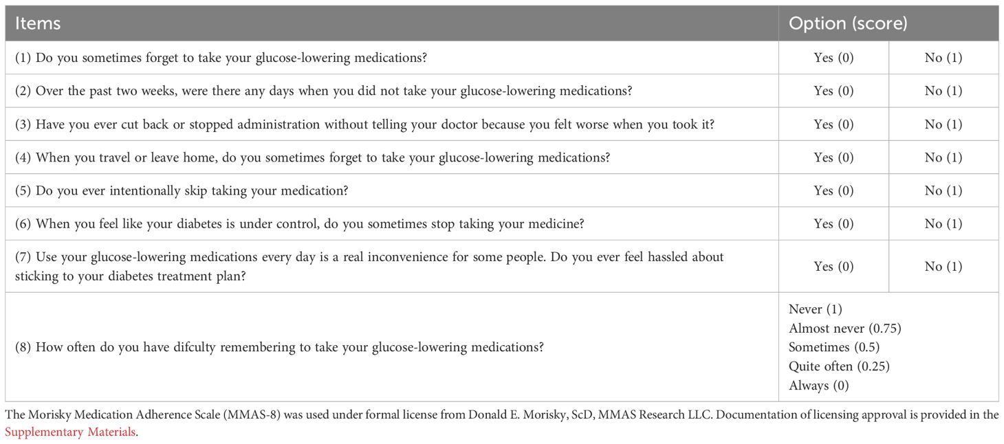 Diabetes patients require ongoing adjustments to their treatment regimens based on glycemic control and overall health, with timely medication changes enhancing treatment adherence and reducing adverse drug interactions. In this study, clinical pharmacists utilized the PCNE-DRP V8.03 classification system to categorize and analyze drug-related problems (DRPs), propose intervention plans, report to the general practitioners in charge of treatment, and document the physicians’ acceptance of pharmacist interventions. The validated 8-item Morisky Medication Adherence Scale (MMAS-8) was employed to evaluate patients’ compliance with prescribed medications (23), as shown in Table 1. An analysis was conducted on changes in the types and quantities of medications, medication adherence, the incidence of DRPs in the experimental group, and the acceptance of medication interventions by doctors and patients before and after management in both groups. This analysis aims to confirm the effectiveness of pharmacist interventions in the medication management of diabetes patients.