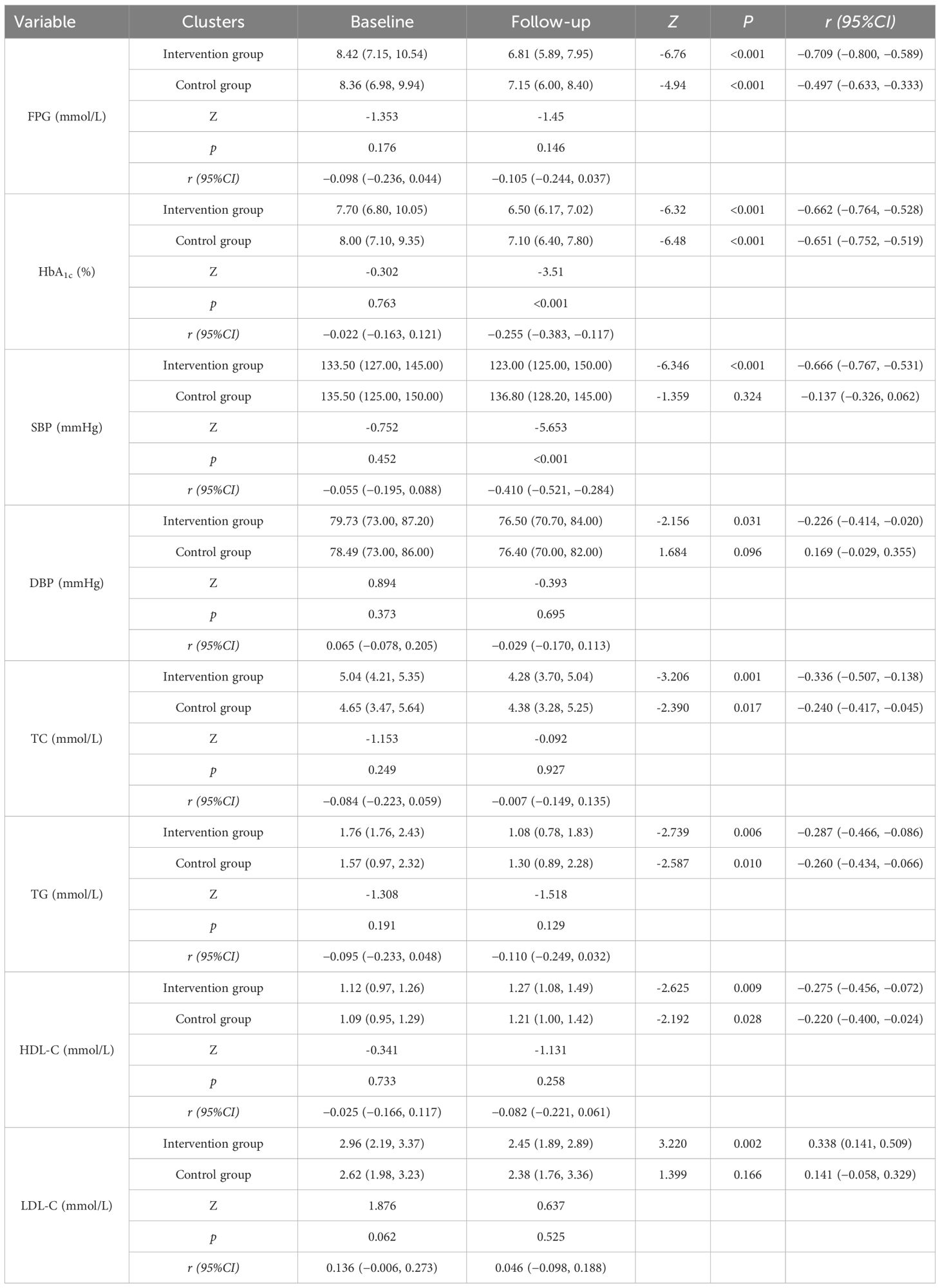 Blood pressure and lipid control indirectly affect glucose levels in patients (32), thus, in addition to assessing glycemic indices, this investigation further examined hypertension and lipid profiles as principal indicators to ascertain the impact of the innovative framework on these health markers. At baseline, both groups had average blood pressure levels within the acceptable range (140/90 mmHg). Following intervention, the treatment group exhibited a statistically meaningful decrease in blood pressure (P<0.05), with systolic blood pressure (SBP) decreasing by approximately 10 mmHg and diastolic blood pressure (DBP) by approximately 2mmHg. According to the 2022 standards of the American Diabetes Association (33), post-management blood pressure in the experimental group reached the target for patients with diabetes and hypertension (<130/80 mmHg) (34). The group not receiving the intervention showed no statistically considerable shifts in blood pressure values. The reduction in the experimental group was similar to findings by Wishah RA et al., where diabetic patients receiving pharmaceutical services showed short-term improvements in SBP and DBP of 4.9-12.1 mmHg and 2.3-7.2 mmHg, respectively (29, 31). Regarding lipid levels, over 12 months, the experimental group showed improvements in total cholesterol (TC), triglycerides (TG), low-density lipoprotein cholesterol (LDL-C), and high-density lipoprotein cholesterol (HDL-C) by 0.76 mmol/L, 0.68 mmol/L, 0.43mmol/L, and 0.15 mmol/L respectively. However, except for LDL-C, no significant between-group differences were found. This suggests that while the pharmacist-led model contributed to modest improvements, its impact on lipid metabolism was limited. Such limitations may be related to the short follow-up period and insufficient lifestyle-focused interventions. Lipid control often requires long-term monitoring, combined dietary and exercise interventions, and possibly more intensive pharmacological adjustments, which were beyond the scope of this model. This indicates that although pharmacological interventions had measurable effects, lifestyle-focused strategies must be strengthened to achieve sustained improvements in lipid control.