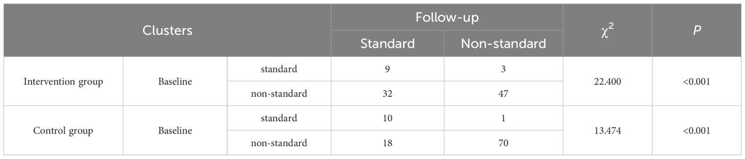 Using HbA1c ≤ 6.5% as the standard level, the changes in the proportion of patients achieving target blood glucose levels before and after management in the two groups were analyzed, as shown in Table 4. Using the corrected chi-square test, the proportion of individuals in the experimental arm who achieved optimal glycemic targets differed significantly between pre- and post-intervention periods (P< 0.001). Using the McNemar exact test, a noteworthy change was observed in the control arm’s results following the intervention, with the difference achieving statistical significance (P< 0.001). However, the number of patients in the control group whose blood glucose levels remained below the target both before and after management was as high as 70.7% (70 cases), and the proportion of patients whose blood glucose did not improve to the target level was substantially higher compared to the experimental group, which was at 5.4%, indicating that the management plan of the experimental group was significantly effective in improving the rate of patients reaching target blood glucose levels.