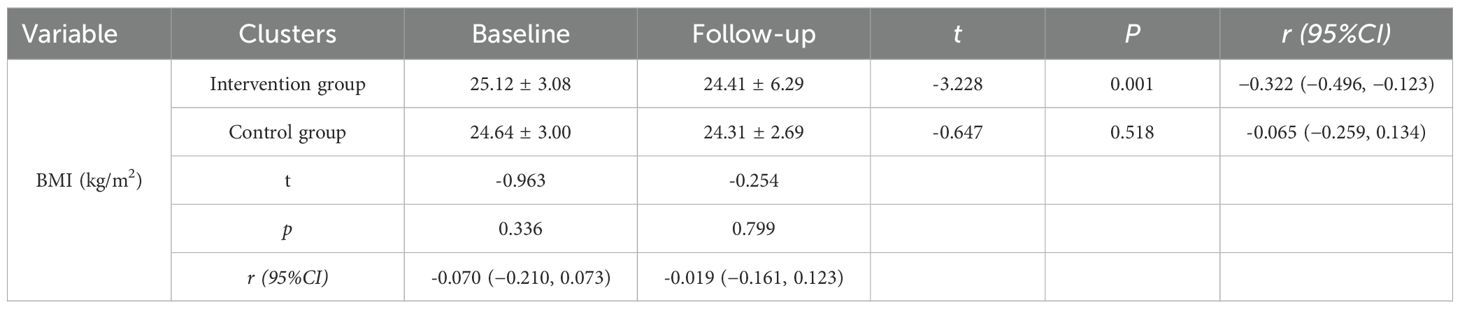 Compared to baseline, the experimental group’s BMI decreased by 0.71 kg/m² (P=0.001), whereas the control group’s BMI decreased by 0.33 kg/m² (P=0.518). Both groups of patients were overweight before management, and although the results show a statistically significant reduction in BMI in the experimental group post-intervention, it still did not reach below-normal levels. Results are shown in Table 5.