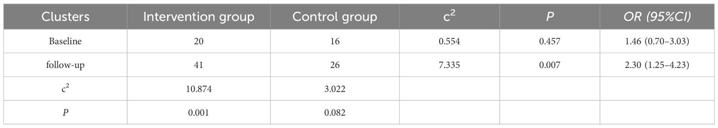 The “3B” achievement rate, which refers to the simultaneous achievement of target levels for blood glucose, blood pressure, and lipids, was analyzed. Results, as evidenced in Table 6, the baseline achievement rates exhibited no statistically significant disparity across the studied groups (P=0.457). A substantial disparity was observed in the achievement rates from baseline to follow-up in the experimental group (P=0.001); however, the variation in achievement rates pre- and post-management in the control group did not reach significance (P=0.082). Post-intervention, the experimental group saw a significant escalation in the number of individuals meeting the 3B standards relative to the control group (P=0.007).