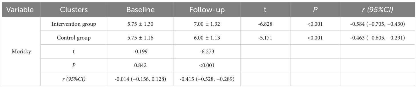 To assess the standardization of patient medication usage, the Morisky Medication Adherence Scale was administered to both study groups. Initially, both groups displayed low adherence levels (P=0.842). After 12 months of intervention, the score in the experimental group increased from 5.75 to 7.00 (P<0.001), while in the control group it rose from 5.75 to 6.00 (P<0.001). The experimental group demonstrated a markedly superior improvement in scores from baseline to post-intervention, compared to the control group, with the difference reaching statistical significance (P<0.001).The scores are displayed in Table 7.
