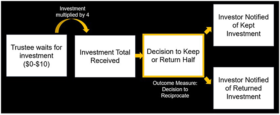 Trust is a highly complex component of decision-making that is strongly influenced by personal beliefs, previous experiences, and individual differences. Trust refers to the extent to which a person expects a social partner to aid them in reaching an optimal decision or goal (Simpson, 2007) and the belief in a partner's reliability or benevolence when outcomes are uncertain (Chang et al., 2010). Having to depend on someone else can be precarious, especially if there have been instances of betrayal, or no previous interactions at all. Prior actions of social partners affect reciprocity, which is the “giving of benefits to another in return for benefits received” (Molm et al., 2007), including previous acts of trust. Thus trust and reciprocity are interrelated. Individuals often have expectations of others to behave in accordance with social norms of fairness, wherein “fairness” represents an expectation that exchanges should follow equitable principles (Fehr and Schmidt, 2000). For instance, people typically believe that if they treat others fairly, they will be treated similarly in return. When partners do not behave fairly in return, the perceived probability of risk increases, leading to diminished trust (Haas, 2021). Significant betrayal can lead individuals to generalize these negative feelings, ultimately reducing trust in others, especially those with whom they have no prior relationship (Lee and Selart, 2015). The literature supports the idea that when individuals must make decisions in times of uncertainty, they tend to make fair choices to avoid feeling guilty (Pelligra, 2011). In addition, they may be motivated in their decision-making to evade adverse experiences that could end in loss (Hartley and Phelps, 2012). Despite the wealth of research on trust-related decision-making, it remains unclear if generosity and betrayal have similar effects, in opposite directions, on future trust decisions. Specifically, it is unknown whether maximum values positively impact trust at the same rate as minimum values negatively impact it.