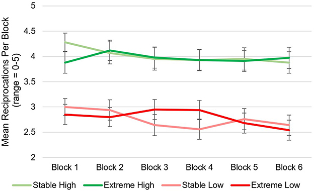 Figure 2. Means and standard errors of the mean of high/low condition, stable/extreme partner, and block (six blocks of five trials) on reciprocation. Means indicate number of reciprocations out of five trials, with minimum 0 (indicating no reciprocations) and maximum 5 (indicating reciprocating on each trial in block).