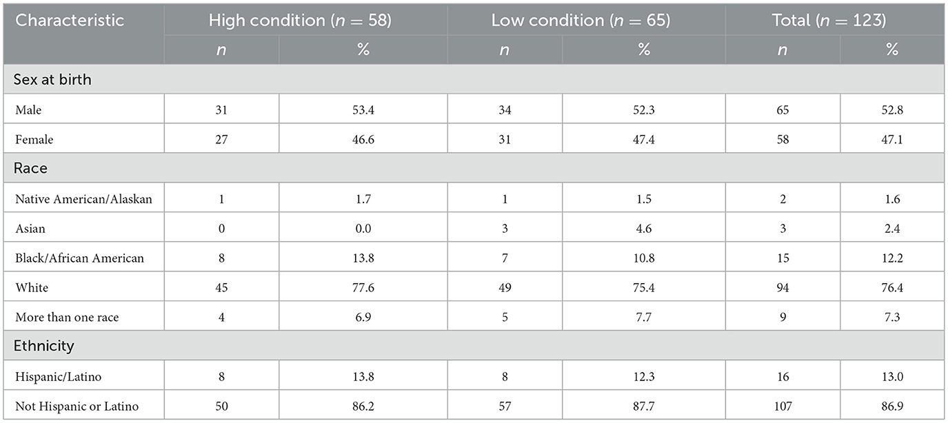 We based our sample size on Zhang and Slovic's (2019) work on the zero effect, where there were approximately 50 participants in each between-subjects condition. Participants (n = 200) were recruited via the online data collection platform Prolific. After reading an explanation of the research, prospective participants could decide whether they were willing to participate. Participants recruitment was limited to those from the United States. Participants had to read and accept the consent form and state that they were 18 years old to proceed to the demographics form and task. Participants received a base pay of $6 and were told that they could receive an additional bonus up to $4 based on a percentage of their earnings across all trials. In reality, all participants were given the maximum bonus, and therefore compensated $10, standard for a 30-min experiment. This compensation cover story, wherein participants are told the bonus amount will be a percentage of earnings across all trials, yet all participants are compensated the same amount regardless of performance, is common with multi-round trust games (Bose and Camerer, 2021). At any time, the participant could close the browser window to end the survey without penalty. As an online study, the trust game paradigm was created in JSPsych and embedded into a Qualtrics survey containing the consent form, the task, follow-up surveys, and a debriefing statement. After excluding participants who either did not complete the entire study or attempted multiple submissions, a total of 123 participants were included in the final analysis. Participants' ages were in the range 19–74 years (M = 40.11 SD = 13.41). See Table 1 for full participant characteristic information. As noted in Section 3, “Results,” the present study observed interactions of within- and between-subject factors with small-to-moderate effect sizes. Post hoc sensitivity analyses indicated that, given the study's final sample size (n = 123), the experiment had >80% power to detect these interactions.