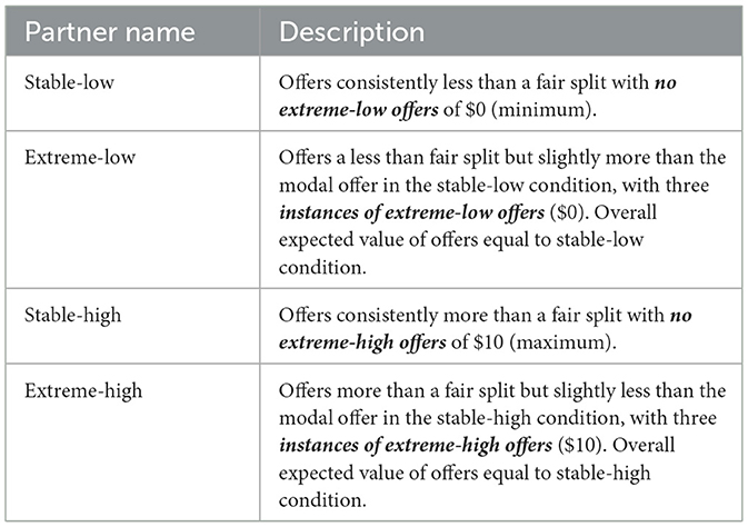 Participants played with two different partners within their assigned high/low group condition (see Table 2). The order in which participants encountered partners within-subjects was counterbalanced. In the high condition, the extreme-high partner offered at or just above a fair split in 90% of trials (M = $7.02; SD = 1.43; range = $5.00–$10.00), with significantly generous offers of the maximum amount of $10 in 10% of trials (pseudo-randomly assigned). The alternate stable-high partner gave offers slightly higher than the modal offer in the extreme-high condition on every trial (M = $7.04; SD = 1.14; range= $5.00–$9.00), with no extreme offers and the same overall expected value across trials as partners in the extreme-high condition. In the low condition, the extreme-low partner invested at or just below a fair split in 90% of trials (M = $2.99; SD = 1.29; range = $0.00–$5.00), with significantly unfair offers of $0 in 10% of trials (pseudo-randomly assigned). The alternate stable-low partner gave offers slightly lower than the modal offer in the extreme-low condition on every trial (M = $3.00; SD = 1.17; range = $1.00–$5.00), with no extreme-low offers and the same overall expected value across trials as partners in the extreme-low condition. With nearly equivalent means, the only component that differed between stable and extreme partners was the range; only extreme partners offered the minimum (low condition) or maximum (high condition). To further support this, t-tests demonstrated that there were no significant differences between stable and extreme partner offers in both the high condition (t = 0.195, p = 0.847), and low condition (t = −0.684, p = 0.500). Thus, our analysis directly isolated the effects of maximum and minimum offers on participant behavior.