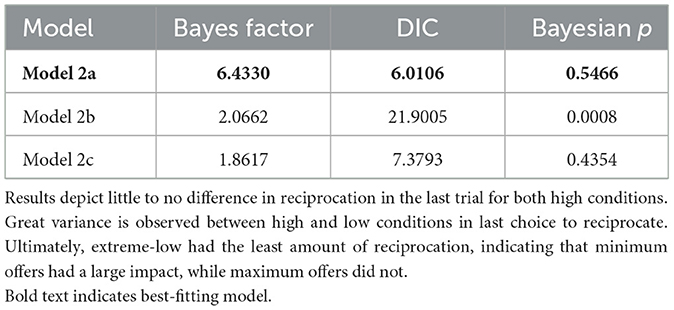 For the second model, we again had two hypotheses. Hypothesis 2a predicted that there would be less reciprocations during the last trial in the low condition than the high condition. Hypothesis 2b postulated that stable partners would receive more reciprocations in the last trial than extreme partners. Both hypotheses were tested in Model 2a, then compared to the inverse (Model 2b) and the null (Model 2c) to determine the best fit. Model 2a was ultimately the best-fitting model due to it having the highest Bayes factor, lowest DIC, and a Bayesian p-value close to 0.5 (See Table 3 for Model 2 results). These results support Hypothesis 2a in that the high condition would receive more reciprocations than the low condition. Although this model was the best fit compared to the inverse and null, we received partial support for Hypothesis 2b. In the low condition, the stable partners did receive more reciprocations than extreme partners, but this did not occur in the high condition. The extreme-high partner received slightly more reciprocations than the stable-high partner. However, the difference in the proportion of reciprocations between extreme-high and stable-high conditions was only 1.66%. This lack of difference supports the notion that maximum ($10) amounts do not create a major impact on reciprocation when all offers are above the median amount or “fair.” Finally, as predicted, the stable-low partner received more reciprocations than the extreme-low partner, demonstrating that the minimum ($0) offers have a greater impact on reciprocation than maximum offers. To provide an alternative test for any response bias starting from the beginning, we conducted chi-squared tests on the decision to reciprocate on the first trial. We found no significant association between condition and decision to reciprocate, in both the high condition [ = 2.94, p = 0.09] and the low condition [ = 0.62, p = 0.43], demonstrating that no prominent response bias was set from the beginning of the trial. We completed this to ensure that reciprocation on the last trial was a valid measure of learned behavior across the entire game.