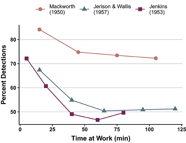 Between the empirical discovery of the vigilance decrement and 1963, the decrement was aptly described and operationalized as an increase in the failure to detect targets with time on task (see Figure 1). A quick survey of this early literature indicates an interest in how various stimulus factors (signal rate, duration, and intensity), situational factors (multitasking, visual deprivation, noise, interpolated rest, sensory modality, drugs, knowledge of results, distracting [non-task-related] events), and participant attributes (authoritarianism, aging, and extraversion/introversion) might affect vigilance and its decrement with time on task. It is noteworthy that these interests have continued unabated to this day, with an increasing emphasis on sleep deprivation and the collection of neuroscientific data.