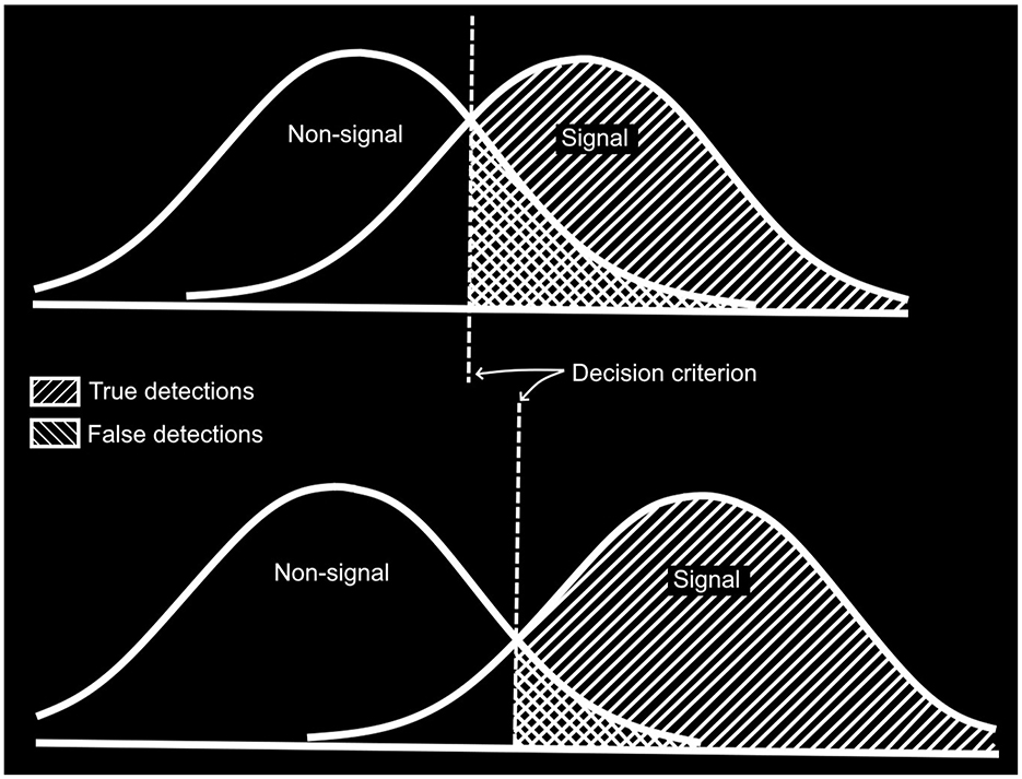 During the discussion (Buckner and McGrath, 1963, pp. 84–85), one of the symposium participants reported that practice (from 1 day to the next) resulted in a decrease in false detections and an increase in correct detections, saying: “I suppose you would say that the observer's criteria for signals had become more stringent with practice,” to which Broadbent responded, “No, that is not so.” He went on to use the blackboard to explain the fundamental ideas behind SDT. The effect of practice described by the participant would be explained by an increase in the separation of the signal and non-signal distributions (as illustrated in Figure 2). This can increase the rate of true detections (hereafter, “hits”) while decreasing the rate of false detections (hereafter, “false alarms” or FAs). Later in the discussion, Broadbent explained: