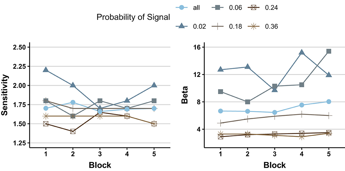 This period is nicely capped off by Baddeley and Colquhoun's (1969) exploration of the effect of signal probability upon performance as a function of time on task. On each trial, one every 2 s, a row of 6 disks was presented. The target was when one of the disks was a little larger than the others, and the probability of target trials varied between 2% and 36%. The authors were primarily interested in how signal probability would affect hits and false alarms, both of which increased with increases in signal probability. For present purposes, we are primarily interested in how time on task affected performance. After showing that both hits and false alarms tended to decrease with time on task (more so in some conditions than others), they shifted their attention to the aforementioned measures from SDT. As can be seen in Figure 3, β computed as C here, was markedly affected by signal probability, with a shift from liberal to conservative as signal probability increased, and it increased significantly (although not a lot) with time on task (more so with lower signal probabilities). Collapsed across signal probabilities, and in line with the two Broadbent and Gregory findings described earlier, d′ was unaffected by time on task.