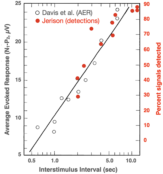 Figure 4. Effects of inter stimulus interval (on a log scale) on probability of detection from near the end of a visual vigilance task and average evoked responses to auditory stimuli (redrawn and corrected from Posner, 1975, who based his figure on Jerison, 1970, Figure 2).