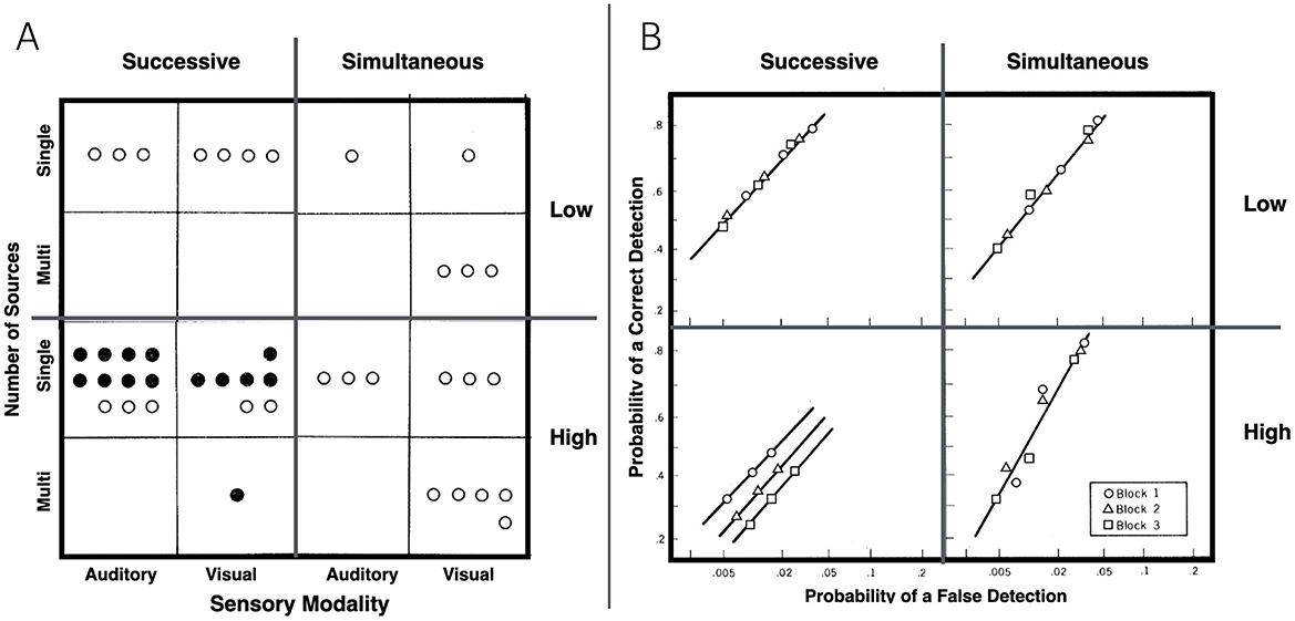 Figure 5. (A) Taxonomy of vigilance tasks, wherein each circle represents a task used in a study that reported a measure of sensitivity [d′, p(a), etc.] and filled circles denote the finding of a reliable decrement in sensitivity with time on task (redrawn from Parasuraman, 1979, Figure 2). (B) Results from four groups of participants performing either a successive or simultaneous auditory detection task with stimuli presented at either a low or high rate (redrawn from Parasuraman, 1979, Figure 1). After practice, participants performed the task for three blocks of 15 min each. Data plotted as circles, triangles, and squares represent the hit and false-alarm rates for blocks 1, 2, and 3, respectively.