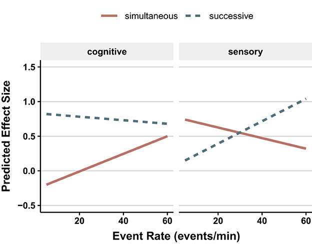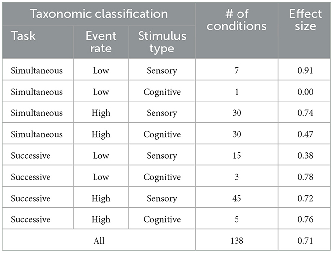 Each condition was classified by task characteristics that had already been shown to affect vigilance or might be expected to do so. From the perspective of this review the most important findings are presented in Figure 6, Table 1. As can be seen in Figure 6, in the vast majority of the 138 conditions there was a positive effect size (decrement in sensitivity) with time-on-task. The average effect size as a function the variables in the authors' revised taxonomy (essentially simultaneous vs. successive tasks, event rate, and whether the stimuli were sensory or cognitive) is presented in Table 1.