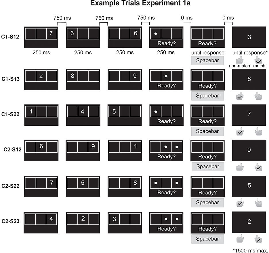 Example trials from Experiment 1a show sequences of three single numbers appearing in varying positions on a horizontal grid—left, middle, or right. Each sequence is followed by one or two dots appearing in specific grid locations. Below the grid, the prompt “Ready?” appears, prompting participants to press the spacebar. Afterward, a single number appears centered on a blank screen, prompting a match or non-match decision. The response options are indicated by hand icons, representing left and right respectively. Six trial types are illustrated: three with one-dot cues and three with two-dot cues, differing in number positions and match outcomes, labeled C1-S12, C1-S13, C1-S22, C2-S12, C2-S22, and C2-S23.