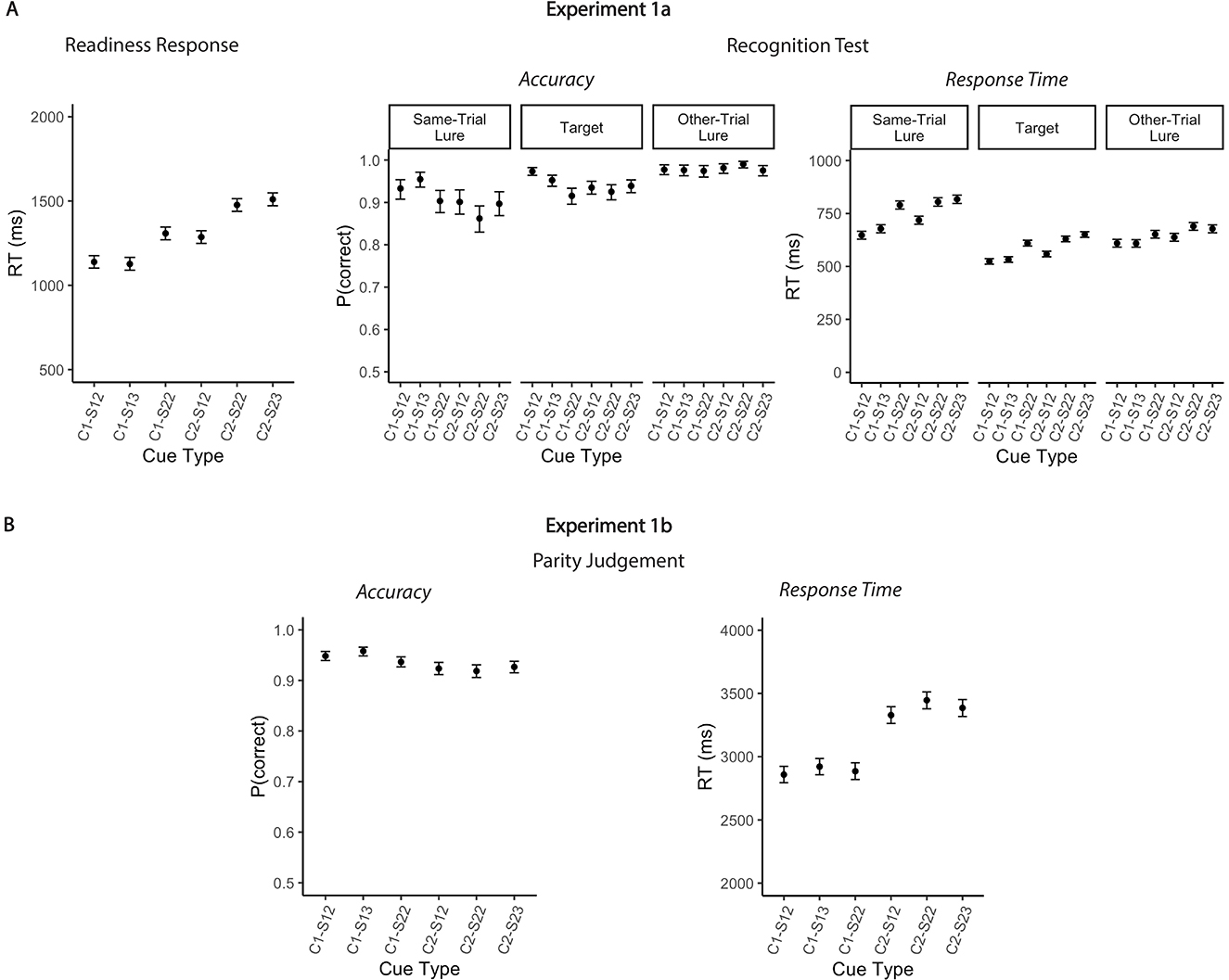 Figure 2. Mean Accuracy rates and reaction times for Experiments 1a and 1b. (A) Left: Mean response times to readiness prompt as a function of cue type in Experiment 1a. Right: Mean accuracies and responses times for the recognition test as a function of cue type and probe type in Experiment 1a. (B) Mean accuracies (left) and responses times (right) for the parity judgement (Experiment 1b). Error bars represent 95% within-subject confidence intervals. C1, single context; C2, dual context; S1, single-target; S2, dual-target.