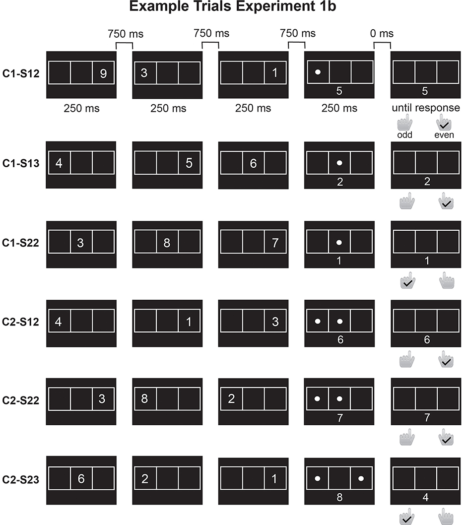 Example trials from Experiment 1b depict six trial types labeled C1-S12, C1-S13, C1-S22, C2-S12, C2-S22, and C2-S23. Each trial shows a sequence of three single numbers appearing in varying positions on a horizontal grid—left, middle, or right—followed by one or two dots in specific grid locations. Along with the dot display, a single digit appears below the grid. The sequence then transitions to an empty grid display. Response options are indicated by hand icons, representing odd and even judgments, respectively.