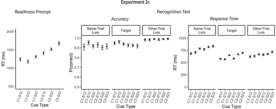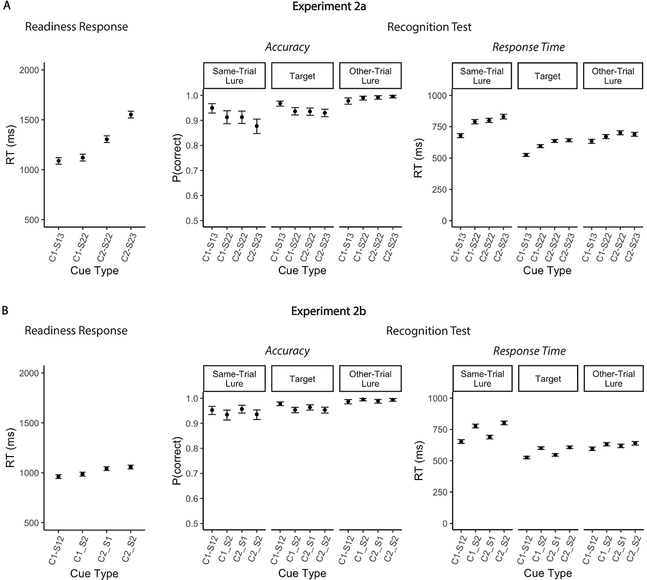 Figure 4. Mean accuracy rates and reaction times for Experiments 2a and 2b. (A) Mean response times to readiness prompt (left) and mean accuracies and responses times for the recognition test (right) in Experiment 2a. (B) Mean response times to readiness prompt (left) and mean accuracies and responses times for the recognition test (right) in Experiment 2b. Error bars represent 95% within-subject confidence intervals. C1, single context; C2, dual context; S1, single-target; S2, dual-target.