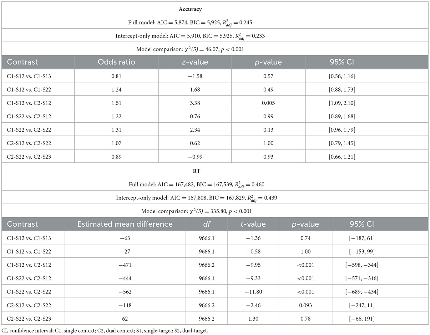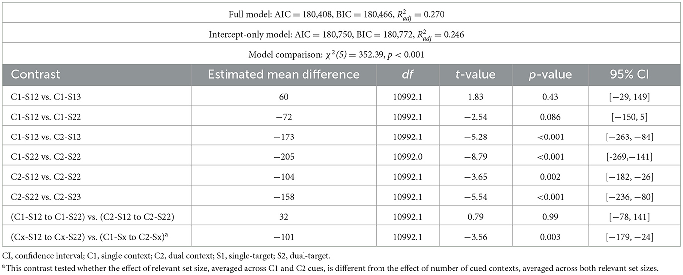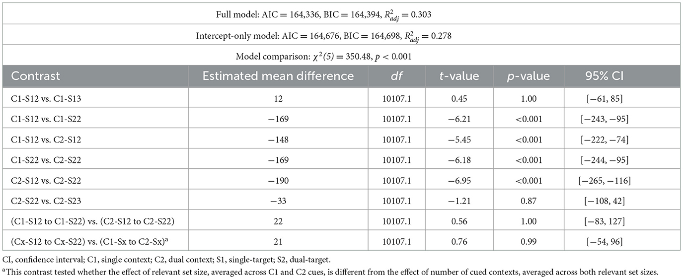 Speed of selection from WM, as indicated by readiness RTs, varied across conditions. Model comparisons confirmed that the full model fit significantly better than the intercept-only model [χ2(5) = 350.48, p < 0.001, Δ AIC = 440, Δ BIC = 304; see Table 1a]. Readiness RTs were slower when two locations were cued compared to when only one location was cued (Figure 2A). Notably, this RT difference was observed both for single-target trials [single-context/single-target/2loc vs. dual-context/single-target/2loc: Mdiff = 148 ms, 95% CIs [74, 222], t(10107.1) = 5.45, p < 0.001] and dual-target trials [dual-context/dual-target/2loc vs. single-context/dual-target/2loc: Mdiff = 169 ms, 95% CIs [95, 244], t(10107.1) = 6.18, p < 0.001]. Further, RTs increased with the number of relevant items, with slower responses in the single-context/dual-target/2loc compared to the single-context/single-target/2loc condition [Mdiff = 169 ms, 95% CIs [95, 243], t(10107.1) = 6.21, p < 0.001] as well as in the dual-context/dual-target/2loc compared to the dual-context/single-target/2loc condition [Mdiff = 190 ms, 95% CIs [116, 265], t(10107.1) = 6.95, p < 0.001]. There was no evidence for an interaction of cue type and relevant set size—the RT difference between single-context and dual-context conditions was comparable across single- vs. dual-target trials [Mdiff = 22 ms, 95% CI [−83, 127], t(10107.1) = 0.56, p = 1.00]. Moreover, the effect of the number of cued spatial contexts on RTs was comparable to the effect of relevant items, i.e., the RT differences between (i) single-context and dual-context trials (averaged across number of targets) and (ii) single-target and dual-target trials (averaged across number of cued contexts) did not differ significantly [Mdiff = 21 ms, 95% CI [−83, 127], t(10107.1) = 0.76, p = 0.99]. Finally, RTs did not differ significantly depending on whether the items in a given set occupied two vs. three distinct grid locations, provided all other factors were held constant [single-context/single-target/3loc vs. single-context/single-target/2loc: Mdiff = 12 ms, 95% CIs [−61, 85], t(10107.1) = 0.45, p = 1.00; dual-context/dual-target/2loc vs. dual-context/dual-target/3loc: Mdiff = 33 ms, 95% CIs [−42, 108], t(10107.1) = 1.21, p = 0.87].