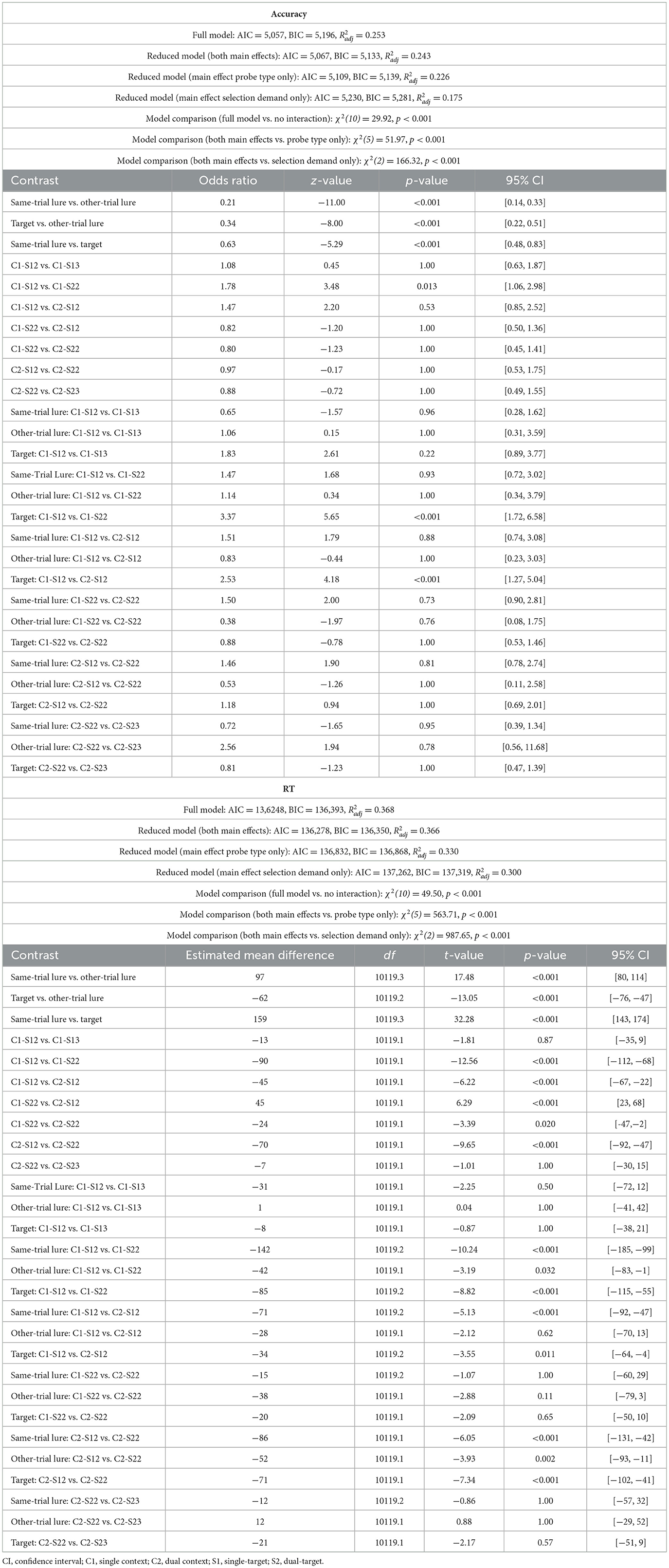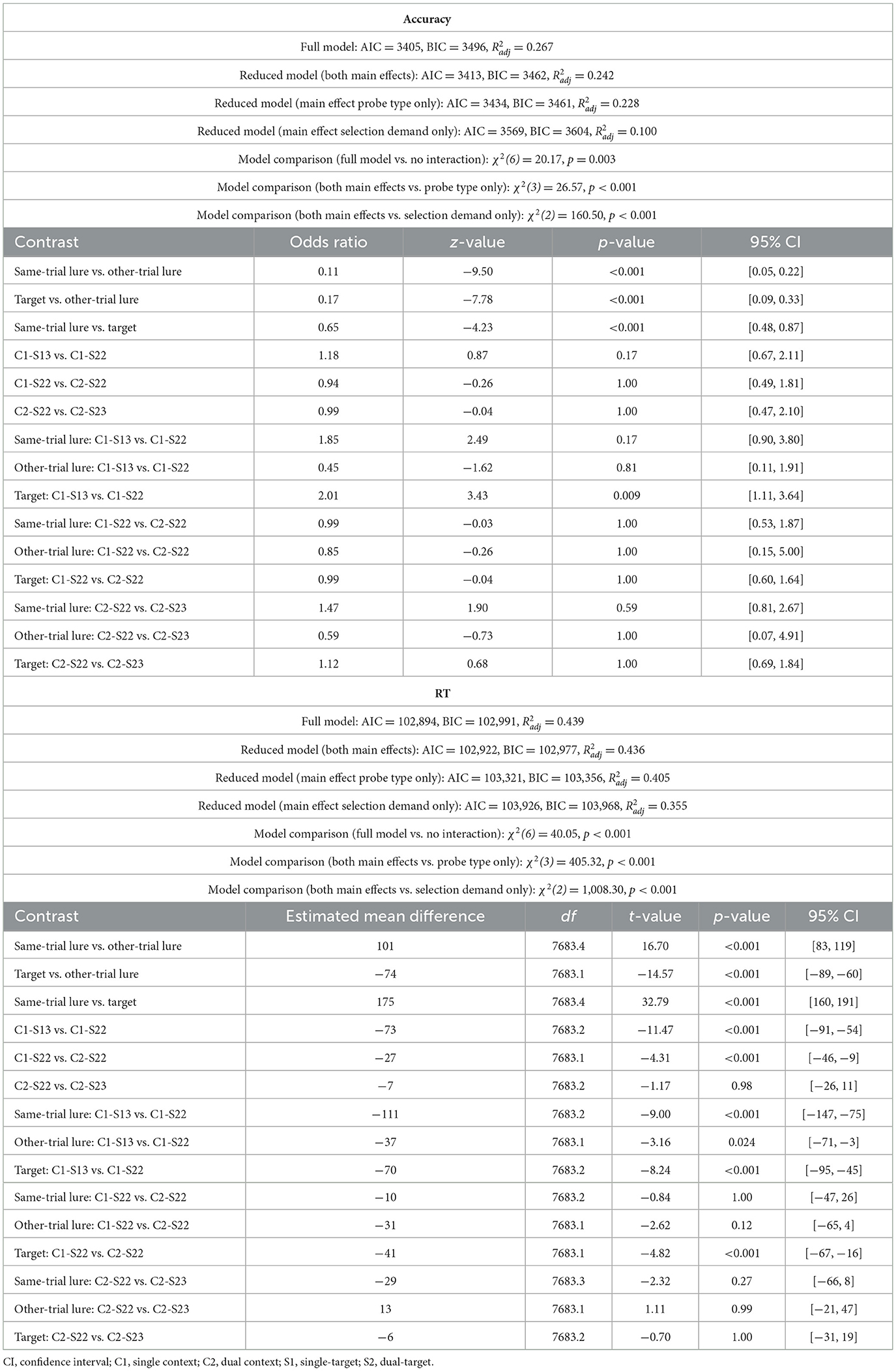 All analyses for this study were performed using R version 4.4.0 (R Core Team, 2024). In a first step, the first five trials of the task as well as trials with responses faster than 200 ms or slower than 8 s were excluded. In a second step, trials were excluded if the RT exceeded the individual mean for each condition by more than three SDs. For the RT analysis, error trials were also excluded. Accuracy rates were analyzed using generalized mixed-effects models with a logit link function (function glmer, R package lme4 v1.1-35.3; Bates et al., 2015), while RTs were analyzed using linear mixed-effects models (function lmer). Degrees of freedom were approximated using the Satterthwaite method (R package lmerTest, v3.1-3; Kuznetsova et al., 2017). Responses to the readiness prompt (RT only) and the probe (RT and accuracy) were analyzed separately. The RT model for the readiness prompt data included the fixed effect of selection demand, with the six levels single-context/single-target/3loc, single-context/single-target/2loc, single-context/dual-target/2loc, dual-context/single-target/2loc, dual-context/dual-target/2loc, and dual-context/dual-target/3loc. The models for probe responses included fixed effects for selection demand and probe type (target, other-trial lure, same-trial lure). All models were initially set up to include participant-wise random intercepts and random slopes for the fixed effects. In case the data did not support the random slopes for each within-subjects main effect, the random-effects structure was simplified following the model selection criteria suggested by (Bates et al. 2015) and Matuschek et al. (2017). Effect coding was used for all predictors. To determine whether main effects and interactions improved model fit, we compared the full model containing the effect of interest with a reduced model that excluded the effect of interest (using function anova). Model fit was evaluated using both the Akaike information criterion (AIC; Akaike, (1974) and Bayes information criterion (BIC; Schwarz, 1978). Standardized model parameters are reported and were calculated using the parameters package (Lüdecke et al., 2020). The function confint from the stats package was used to calculate likelihood profile confidence intervals for all parameter estimates. In contrast, the error bars in all figures represent within-subjects confidence intervals (95%), estimated using parametric bootstrapping (percentile-based intervals) as implemented by the function bootMer from the lme4 package. Significant main effects and interactions were followed up with custom post-hoc comparisons using the emmeans package (v1.10.1, Lenth, 2024). Šidák correction was used to control the family-wise error rate.