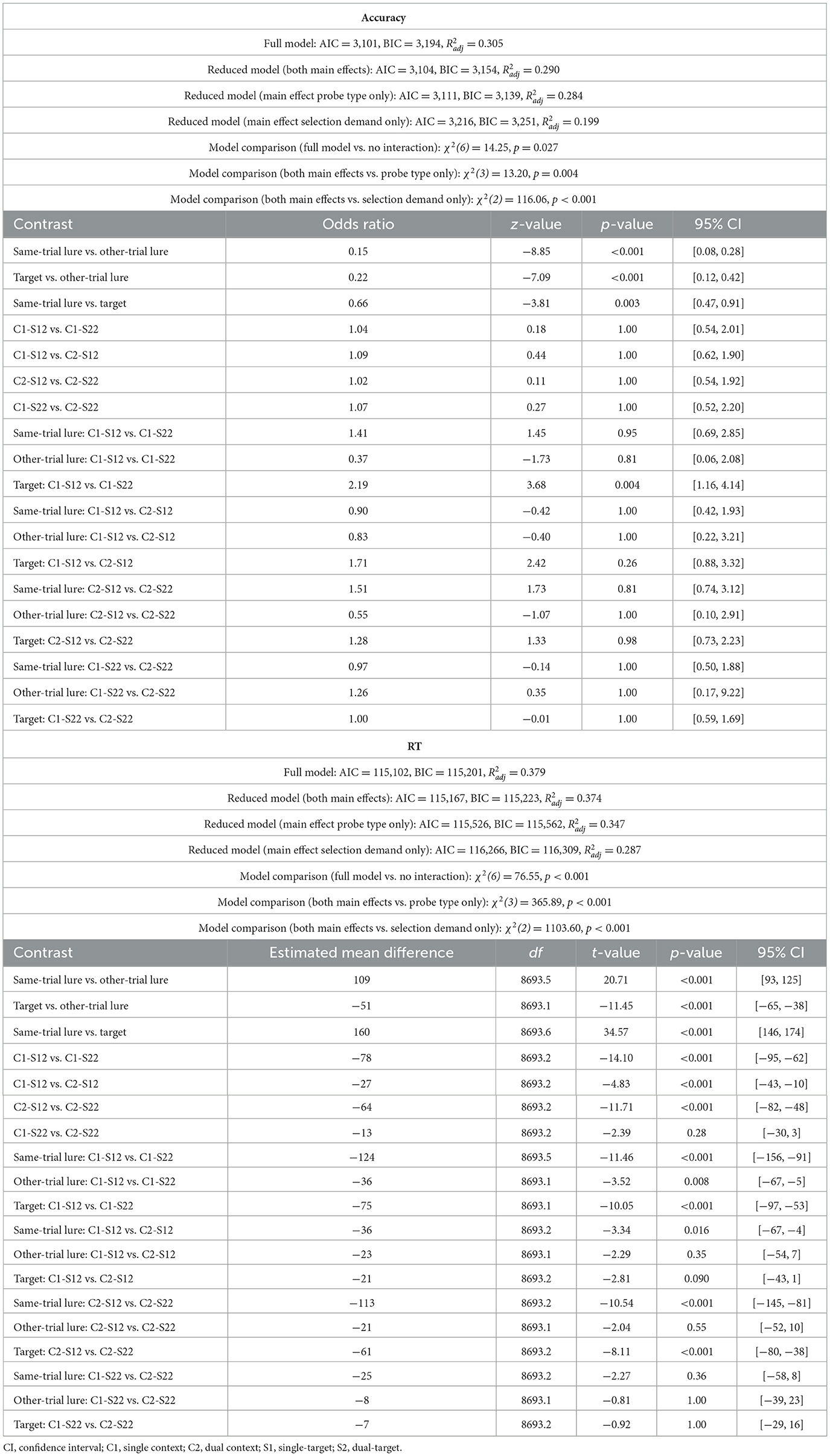 Table 3b. Model fit and post-hoc comparisons for probe response (Experiment 2a).