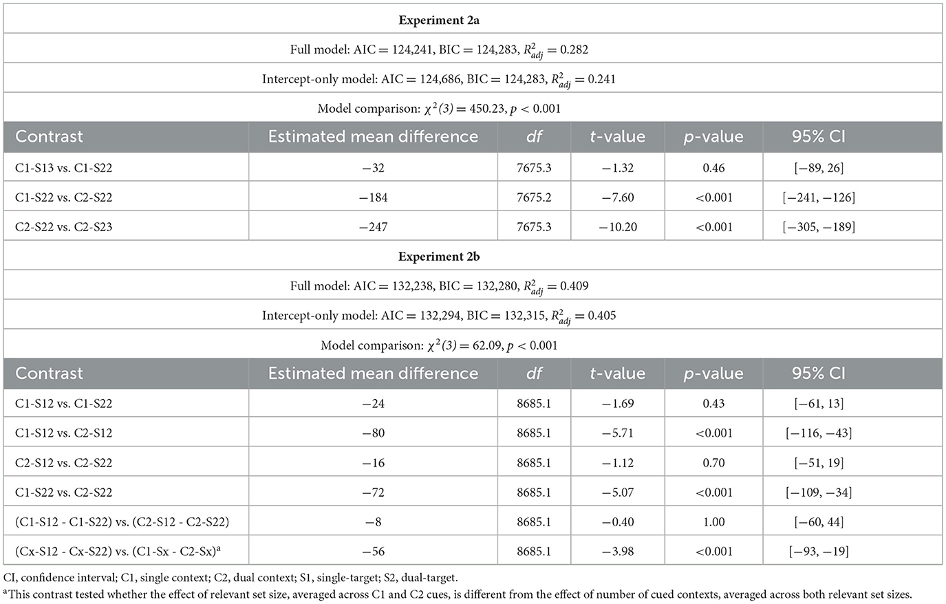 Model comparisons confirmed that the full model fit significantly better than the intercept-only model [Experiment 2a: χ2(3) = 450.23, p < 0.001, Δ AIC = 445, Δ BIC = 424; Experiment 2b: χ2(3) = 62.09, p < 0.001, Δ AIC = 56, Δ BIC = 35] (Table 3a). Overall, readiness RTs were slower when two locations were cued (dual context) than when only one location was cued (single-context), replicating the spatial context effect observed in Experiments 1a and 1b (Figure 4A). Specifically, in Experiment 2a, response speed was reduced in the dual-context/dual-target/2loc condition compared to the single-context/dual-target/2loc condition [mean difference 184 ms, 95% CI [126, 241], t(7675.2) = 7.60, p < 0.001; note that due to exclusion of the dual-context/single-target/2loc condition, the effect of context could not be tested for single target trials]. A similar pattern was observed in Experiment 2b, with longer response latencies for dual context trials than for single-context trials, both when one item was relevant [dual-context/single-target/2loc vs. single-context/single-target/2loc: mean difference 80 ms, 95% CI [45, 114], t(8685.1) = 5.71, p < 0.001] and when two items were relevant [single-context/dual-target/2loc vs. dual-context/dual-target/2loc: mean difference 72 ms, 95% CI [36, 107], t(8685.1) = 5.07, p < 0.001]. The strong convergence of findings across three experiments indicates that the context effect on readiness RT is quite robust and not a mere artifact of learned task contingencies.