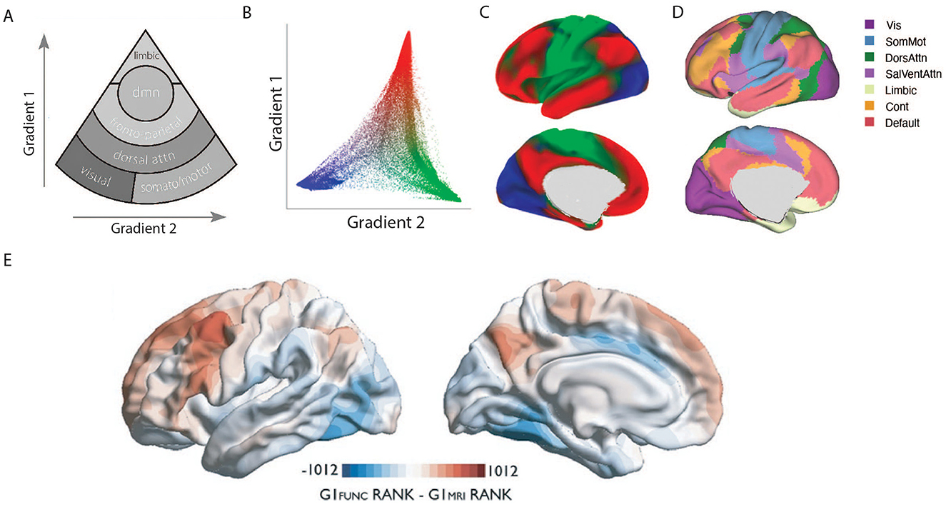 In recent years, a complementary framework has emerged, proposing that the cortex is organized along continuous gradients rather than sharp boundaries. Typically derived by applying non-linear dimensionality reduction techniques (e.g., diffusion map embedding) to functional connectivity matrices, these gradients describe smooth transitions in connectivity, microstructure, and function across the cortical surface, offering a low-dimensional scaffold that unites diverse aspects of brain organization (Huntenburg et al., 2018; Margulies et al., 2016; Vos De Wael et al., 2020). The principal gradient, for example, extends from unimodal sensory and motor regions to transmodal association cortex, with the Limbic and Default Mode Networks (DMN) at its apex (See Figure 1). This axis captures a fundamental shift from externally oriented, stimulus-driven processing to internally directed, abstract cognition. By embedding the cortex in a continuous gradient space, researchers can link large-scale anatomy to functional hierarchies. Several measurable properties can be derived from these embeddings, including eccentricity (distance from the manifold center, indexing a region's segregation), node rank (its hierarchical position along a gradient), and displacement (reconfiguration across conditions) See Box1. This framework also provides a powerful lens for examining how the brain flexibly supports cognition and how these organizational principles are altered in clinical disorders.