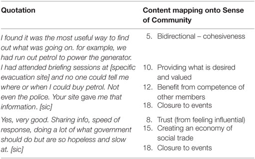People emphasized the importance of mutual assistance in their experience of their disaster response and recovery; it created a “sense of community spirit and support,” with people willing to help others. People commented that the disaster brought people together and that goodwill was contagious; that “helping breeds helping.” The page, thus, provided a mechanism to realize people’s “in-built desire to help.” By creating a social setting that mobilized active and functional involvement, the TFWCH page created other opportunities for the emergence of the Membership, Influence, and Integration (see Table 1) facets of SoC. The development of SoC in this context was assisted by the page affording opportunities for communication built around the reciprocal exchange of information and resources.