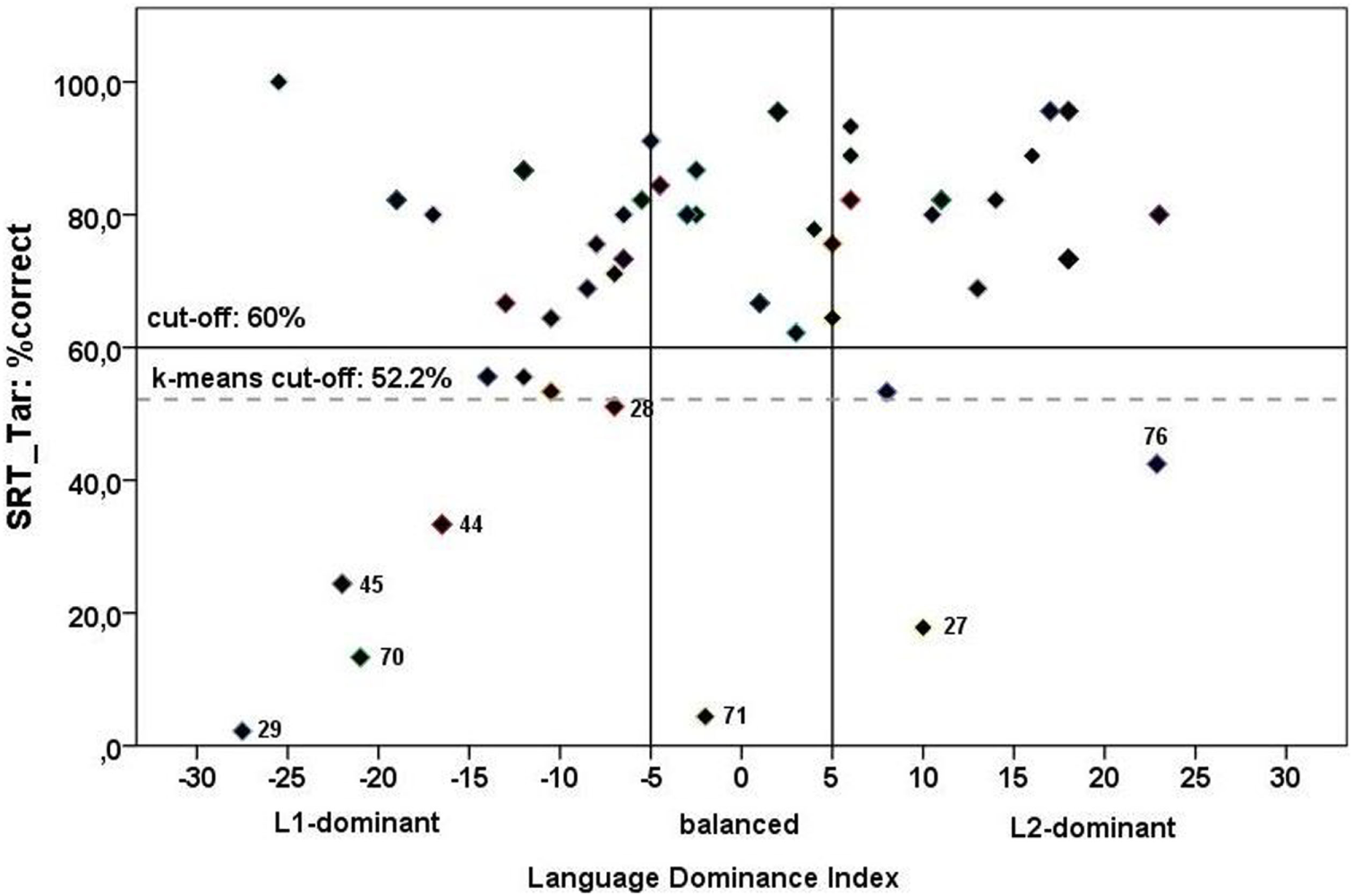Returning to the factors influencing bilingual development, they allowed us to determine an L2 Exposure Index and an L1 Exposure Index. These indexes were calculated by weighing factors such as AoO, LoE, language use, and richness at home, at school, in extracurricular activities, before and after the age of 4 years. The Language Dominance Index (LDI) can be calculated as the difference between the L2 and the L1 exposure indexes. Given the individual contributions of the factors in L1 and L2, the LDI ranges from −50 to +50. For the project, several cutoff points were explored and compared with impressions of bilingual investigators, specifically taking into account free conversation and the samples of spontaneous speech collected for each child in each language (see also Almeida et al., 2017). Following that procedure, we define bilingual children in Germany as balanced if they score between the values of −5 and +5 of the LDI (−5 ≤ LDI ≤ +5). Children with an LDI below −5 are considered L1 dominant whereas children with an LDI above +5 are classified as L2 dominant.