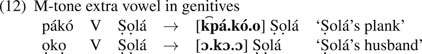 In genitive constructions, an M-tone extra vowel is realised on the possessum (Akinlabi and Liberman, 2001). Consider the examples below 8).