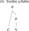 The syllable template is represented using a moraic structure in 4). Under standard moraic theory, a vowel projects a mora, which is a unit of length (Hyman, 1985; McCarthy, 1986; Hayes, 1989). Following the account in (Orie, 2000), only a vowel with an onset consonant (CV) can project a syllable in Standard Yorùbá. In this account, a V unit constitutes a mora, not a syllable.