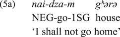 In Type-C, the standard verbal negation marker is used as a negative existential marker, without an affirmative existential marker. This was illustrated above by the Tongan examples in (3a-b), where the standard verbal negation marker ’ikai is also used as the negative existential marker in (3b). In the intermediate Type-BC a special negative existential marker is also used as a verbal negation marker under some circumstances, but other verbal negation markers also exist. That is, the domain of verbal negation includes several markers, one of which also functions as the negative existential marker. This is illustrated by (5a-c), from Darai (Indo-Aryan). The clauses in (5a-b) illustrate two Darai verbal negation constructions: the nai‐ prefix in (5a) and in (5b) the particle nidzə. This particle is also used in (5c) as the negative existential marker, without the Darai affirmative existential copulas. Thus, in Darai a special negative existential marker is also used as one of the verbal negation markers.
