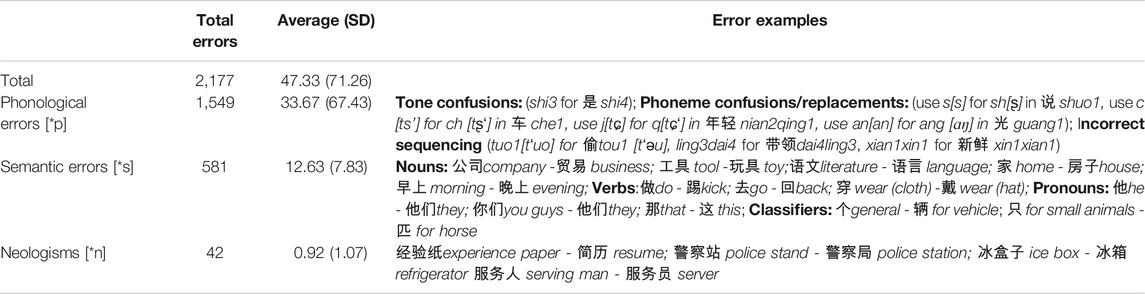 TABLE 4. Total and average number of production errors shown in second language learners’ L2 (Chinese). Data is averaged over 46 participants (with English as L1) from the COPA Corpus on TalkBank (Zhang, 2009a).