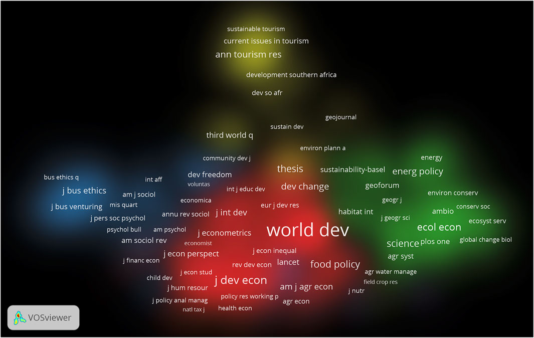 Figure 7 gives the co-citation heat map of sources, based on their density. We set the threshold at 20, and 78 cited sources remained on the map. Different colors signify different clusters of co-citation. The lighter the color, the more frequently the journals are cited. There are four major categories. World development and the Journal of Development Economics have the largest influence on the red cluster, which mainly contains development and economic studies. The second cluster is green and includes the fields of energy, environment, and ecology, with Ecology Economics as its brightest star. The Journal of Business Ethics and Annals of Tourism Research are the most-cited journals in the third and fourth cluster, which represents the fields of business and tourism. Some psychology studies exist in transitional spaces between business studies and economic studies, suggesting a trend of interdisciplinary work. In the past 10 years, we checked manually that psychology and other interdisciplinary research performed well. Many papers were published in Science or Nature. In the research of Mani et al. (2013), there was a causal relationship between poverty and psychological function. Poverty reduced the cognitive performance of the poor, because poverty consumes spiritual resources, leaving fewer cognitive resources to guide choices and actions. Another psychology-based experiment in Togo showed that personal proactive training increased the profits of poor businesses by 30%, while traditional training influence was not significant (Campos et al., 2017). In the study of Ludwig et al. (2012), they revealed that the shift from high-poverty to low-poverty communities resulted in significant long-term improvements in physical and mental health and subjective well-being and had a continuing impact on collective efficacy and neighborhood security.