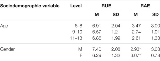 Second, Figure 2 shows no clear stratification by respondent age, as going from the left on the x-axis (youngest respondents) to the right (oldest respondents), the graphs are roughly stable and show no clear upward trend. A Kruskal Wallis rank sum test based on a categorization into three age groups (6–8 years/o, 9–10 years/o and 11–13 years/o), indeed, shows no stratification by age for RAE (H(2) = 0.483, p > 0.05), RUE (H(2) = 0.087, p > 0.05) nor for RAE + RUE (H(2) = 0.039, p > 0.05).