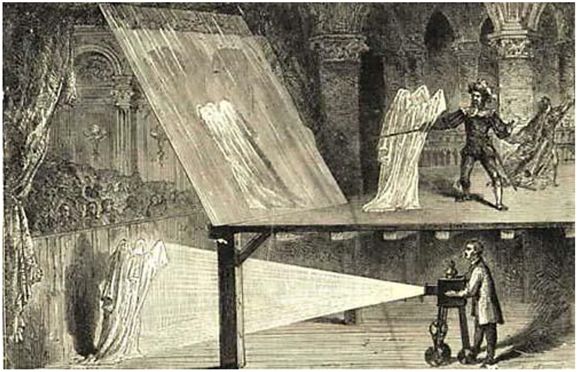 One surviving playbill from 1802 describes the magician Paul de Philipsthal bringing his Phantasmagoria to London's Lyceum Theater on The Strand (see Barber, 1989, p. 78–79; Barnouw, 1981, p. 23), though, according to Barber, the show started in late 1801. Ghost lantern shows were a very popular form of entertainment in the opening decades of the 19th Century in the US and England, being particularly popular in the US between 1803 and 1839 (Barber, 1989, p. 78).9 However, one of the fundamental limitations that may well have led to their eventual demise as a form of popular entertainment was the static nature of the images shown; Being painted on glass, they lacked the necessary vitality (see Hopkins, 2020, p. 7). By enabling the projection of living people into the air (Hopkins, 2020, p. 8), Dr. Pepper's Ghost, a Victorian device for creating animated ghostly illusions on the stage (Burdekin, 2015), was to change all that.