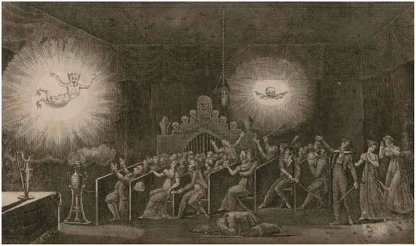 Barber (1989) dates the origins of the phantasmagoria, or ghost lantern show, where shadows of skeletons and ghosts were projected on screens and walls in darkened atmospheric environments, to the end of the 18th Century in France. Barber argues that Étienne-Gaspard Robertson's Fantasmagorie (coined from the Greek “Phantasmagoria”, meaning assembly of phantasms; Warner, 2006–2007 was probably the most influential magic lantern ghost show of the early 19th century (Robertson, 1831).7 According to Barber, Robertson who came from Liège, Belgium, first staged his exhibition at the Pavillon de l'Echiquier in Paris in around 1799 (though earlier dates have been mentioned by others). For instance, Barnouw (1981, p. 19) dates Robertson's arrival in Paris 5 years earlier, to 1794. The exhibition soon moved to an abandoned chapel (abandoned by the resident nuns following the 1790 Revolution; see Mannoni and Brewster, 1996, p. 403), around December 23rd, 1798 (see Mannoni and Brewster, 1996) the Gothic convent at the Couvent des Capucines, in Paris, where it played for six years (see Barber, 1989, p. 74). According to Barnouw (1981, p. 19), this move may have happened as early as 1797 (Appropriately enough, the latter venue had formerly held the skeletal remains of monks.) An engraving that appears at the front of Robertson's book highlight the rear-projection of the slides onto smoke that were an occasional feature of the early fantasmagoria (see Figure 1), along with the more conventional screen-based projections (see Barnouw, 1981; Chapter 3. The Fantasms; see also Ndalianis, 2004).