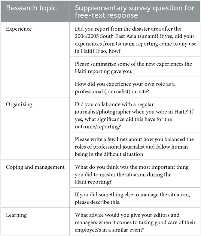 Our research questions generated eight survey questions: these open-ended questions offering free-text responses are presented in Table 2. Some of the questions were derived from two previous journalist studies: a study of Norwegian journalists covering the Tsunami disaster 2004 (Thoresen, 2007), and an interview study of Swedish journalists covering the Gothenburg fire 1998 (Englund, 2018/2008).