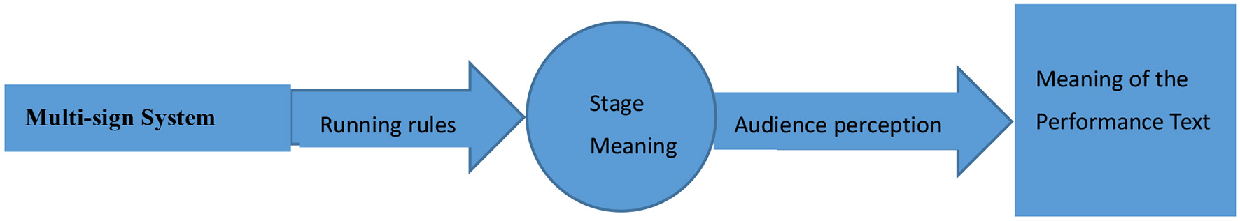In order to translate a stage performance, the translator should first understand the generation mechanism of meaning and its final realization process, which should begin with the perspective of theater composition in semiotics of theater and drama. Mukarovsky (1976) used the terms “signifier” and “signified” by Saussure, regarding sign as a two-faced entity linking a material vehicle or signifier with a mental concept or signified. He pointed out that all the sign systems in the theater constitute a whole, namely “signifier” (ensemble of material elements), and “signified” (aesthetic object) exists in the public collective consciousness for aesthetic purposes. Performance Text is actually a “Macro sign” whose significance lies in its overall effect and acceptance depends on the audience's aesthetic knowledge. This point of view emphasizes the necessity of all components for the formation of the overall meaning. At the same time, it also regards the audience as the decisive factor for the ultimate realization of meaning, that is, the meaning of theater is equal to the meaning constructed by all of the sign systems as well as the audience's response. According to this, we can try to give the meaning- generation process of the performance text of Peking Opera: