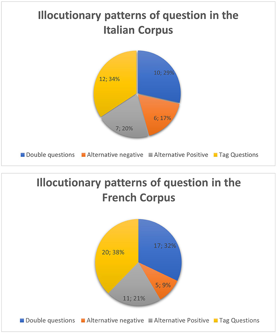 We also counted what we can call “spurious” instances, such as rhetorical questions, self-questions, echo questions, questions used as dialogic moves, and surprise questions (14% in Italian and 22% in French). They are usually considered questions by mother-tongue speakers, although the criterion regarding the addressee's answer is not satisfied. According to a general system of illocutionary assignment (Sbisà and Turner, 2013), indeed, it is the addressee's behavior that guarantees the directive value of an act of question, which is an essential illocutionary feature.