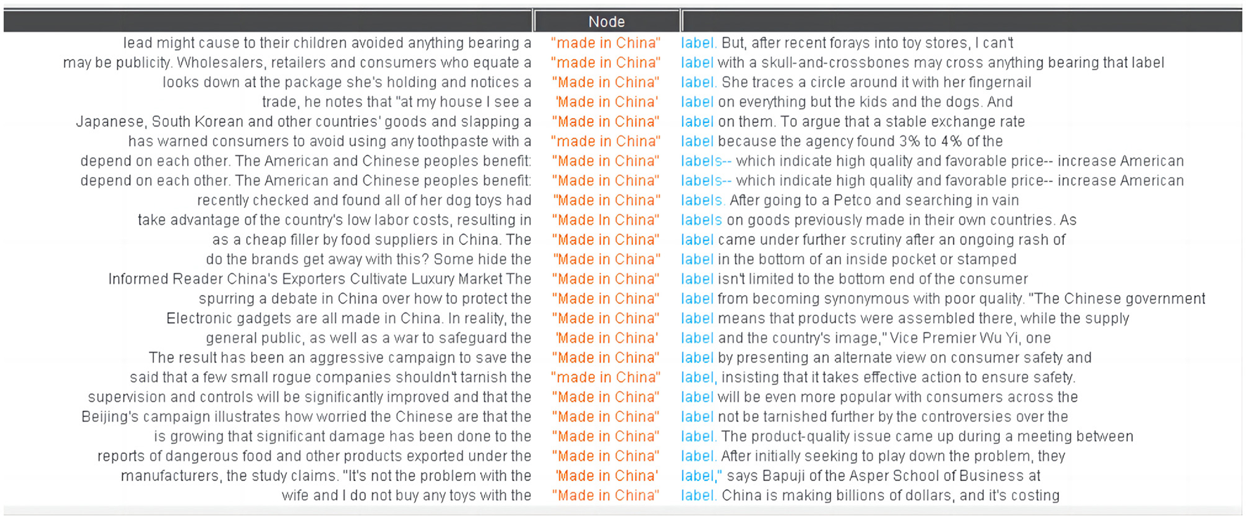 The corpora were analyzed using the corpus tool #LancsBox (Brezina et al., 2018). To identify the topics associated with MIC, we first got the list of top 100 high-frequency noun lemmas from each sub-corpus. The lemmatization approach is provided by the tool Tree Tagger. The lemmas were then categorized into topics and sub-topics according to dictionary definitions and their use in the co-texts. Take the topic of Economy in the U.S. corpus as an example. It includes four sub-topics that involve different lemmas—Entity (e.g., company_n, group_n, store_n), Finance (e.g., investment_n, money_n, dollar_n), Market (e.g., consumer_n, price_n, sale_n), and Trade (e.g., cost_n, export_n, tariff_n). Appendix C shows the composition of topics, which specifically highlights the differences between two corpora and will be illustrated in Section 4.1. We identified two polysemes among the noun lemmas. They were categorized into different topics based on different contextual meanings. Instances of the lemma time_n were identified as belonging to the topic Time or to the sub-topic Quantity of the topic Development, and those of the lemma part_n were categorized into the sub-topic Product of the topic Production or into the sub-topic Quantity of the topic Development. For identifying and tracing the attitudes attributed to the lexical combinations MIC+N that consistently appeared across three periods, we first examined the R1 consistent collocates (c-collocates) of the term “Made in China” (the word in the first slot to the right of the central word) across periods. Frequency was chosen as the collocation measure, with a minimum of five occurrences. There are four R1 c-collocates of MIC [brand(s), goods, label(s), and product(s)] in the Chinese articles and two [label(s) and product(s)] in the U.S. articles. Figure 2 is a screenshot of the consistent collocations (c-collocations) situated in the concordances of #LancsBox. Through examining the collocates of these lexical combinations and reading the concordances, we identified the semantic prosodies based on the Sinclarian model using the mixed-method corpus tool MAXQDA (VERBI Software, 2021). In cases where the concordance line was insufficient to identify the semantic prosody, we extended the reading to a larger text window. Table 4 shows the categorization of semantic prosodies and the corresponding attitudes, which will be explained in more details in Section 4.2.1. The categorization of topics and semantic prosodies were finished by the first author. She did the categorization repeatedly over time, three times in total, to make sure the categorization is stable and reliable. Any problems were discussed in the research team. Finally, we embrace the tenet of CDA—the interaction of discourse, ideology, and society—to explore the similarities and differences between newspapers in the representation of MIC and the underlying ideologies.
