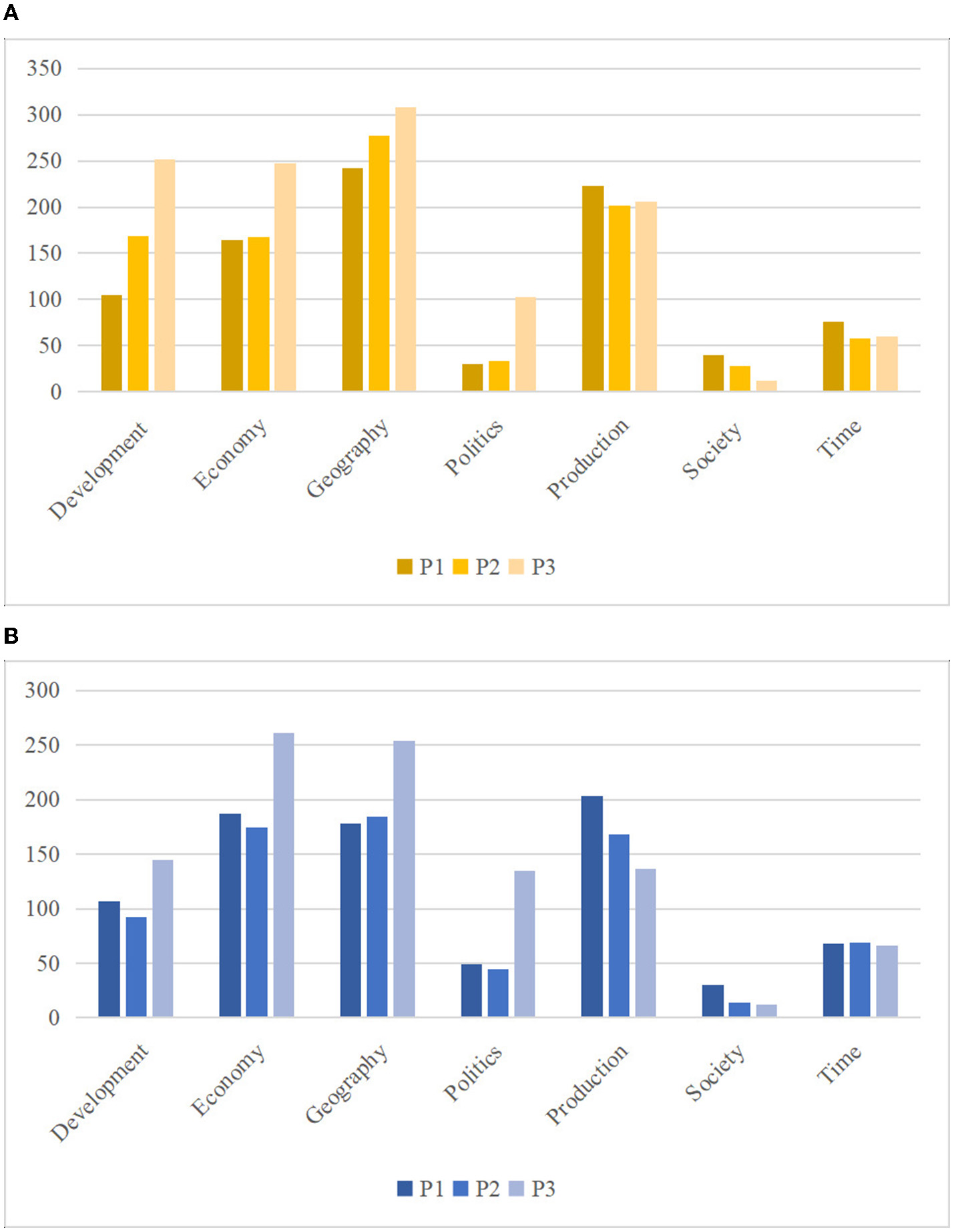 Through examining the topics across periods (see Figures 3A, B), we found similar trends in two topics, (i) Geography with increasing lemmas, and (ii) Society with decreasing lemmas. As for Production, the corpora only share the decreasing trend from Period 1 to 2; and regarding Development, Economy, and Politics, the corpora only share the increasing trend from Periods 2 to 3. Time shows no parallel trends—the Chinese corpus presents decreasing frequencies, while the U.S. corpus demonstrates relatively stable numbers of lemmas. In the Chinese corpus, Geography always ranks first across periods. The U.S. corpus shows a shift in top topic, from Production (24.7%) in Period 1, Geography (24.7%) in Period 2, to Economy (25.9%) in Period 3, which reflects the change of media attention from product scandals in Period 1 to trade war in Period 3.