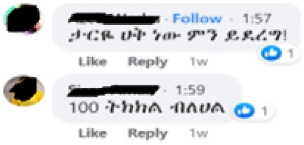 In appreciating the troll, motivators could show their presence in attending the speech by greeting the troll (to tell they are attending the life transmission), receiving orders from the troll, requesting actions (such as blocking those who disturb the online transmission), asking for more hate speech (e.g., “you have to write a book regarding their barbaric nature,” “you must expose the hidden evils more and more...please,” “I watched it twice, and I still need more of it”), or parroting the exact words of the troll to show how they are impressed with the remark. For example, borrowing the words from a troll in a hate video, a motivator is observed commenting that same phrase “ወንዝ ለወንዝ መቀደስ ያረፈ ሰይጣን መቀስቀስ; ካልጠፋ ቡኸር ነብር አደን!... Wow! Well said).” The expressions in Amharic language are exactly borrowed from the troll in a hate filled video who disparages its target. It should be noted that the above comments are in response to hateful discussions that devalues its target.
