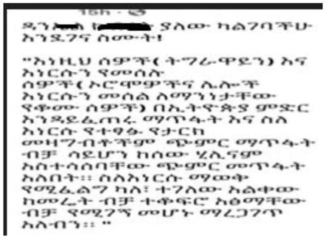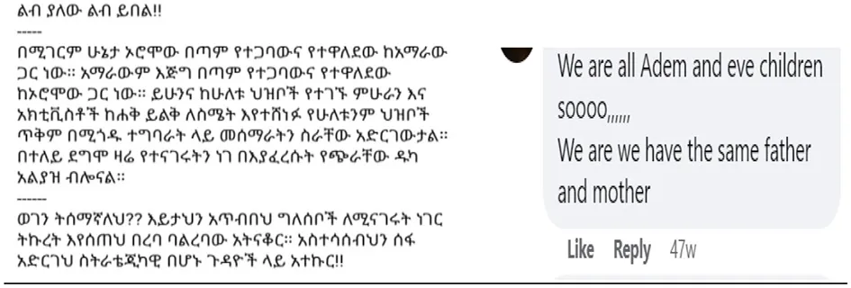 The interpreter, nonetheless, could play harmful roles by (mis) interpreting others' messages or deeds in a way to annoy targets or damage the social fabric of the society, as evidenced by the following quote: “They must be kidding if they tell you that they want to help you in the Wolqite5 case while brutally killing you in Shashemene,6 Wollega,7 and Arsi (see text footnote 7).” In addition, in the screenshot below, a prominent figure is interpreting the words of another prominent figure from a different ethnic group and thereby ostensibly distorting the source's intent.